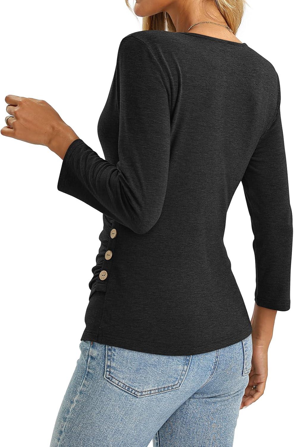 Deep V Neck 3/4 Length Sleeve Tops for Women Ruched Sexy Slim Fit Button Side Blouse(Black)