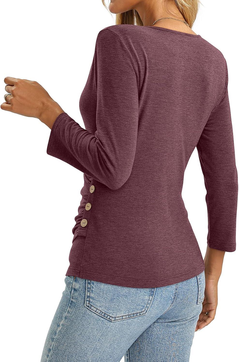 Deep V Neck 3/4 Length Sleeve Tops for Women Ruched Sexy Slim Fit Button Side Blouse(Burgundy)