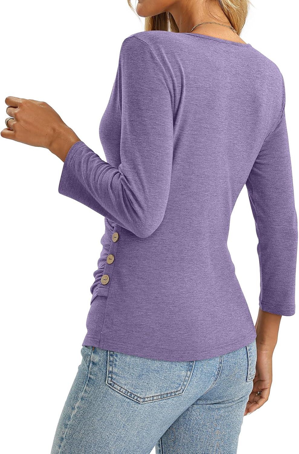Deep V Neck 3/4 Length Sleeve Tops for Women Ruched Sexy Slim Fit Button Side Blouse(Purple)