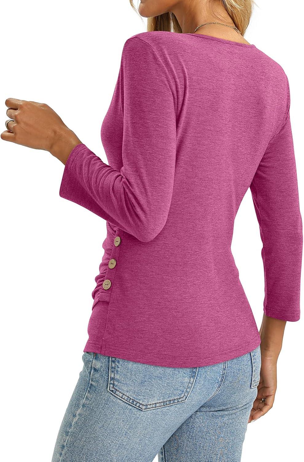 Deep V Neck 3/4 Length Sleeve Tops for Women Ruched Sexy Slim Fit Button Side Blouse(Rose Pink)