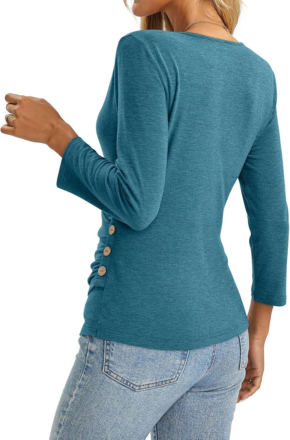 Deep V Neck 3/4 Length Sleeve Tops for Women Ruched Sexy Slim Fit Button Side Blouse(Teal Blue)