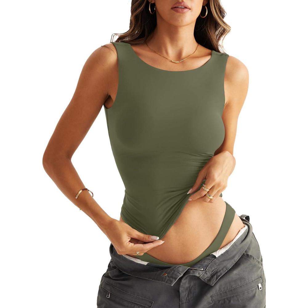 Women Sleeveless Boat Neck Tops Double Lined Backless Tank Tops Basic Fitted T Shirts 2025(Army Green)