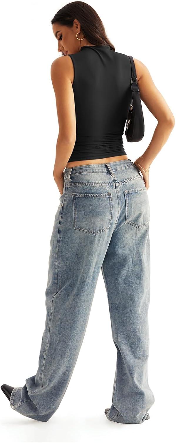 Women Sleeveless Mock Turtle Neck Tops Double Lined Fitted Tank Tops Basic T Shirts 2025(Black)