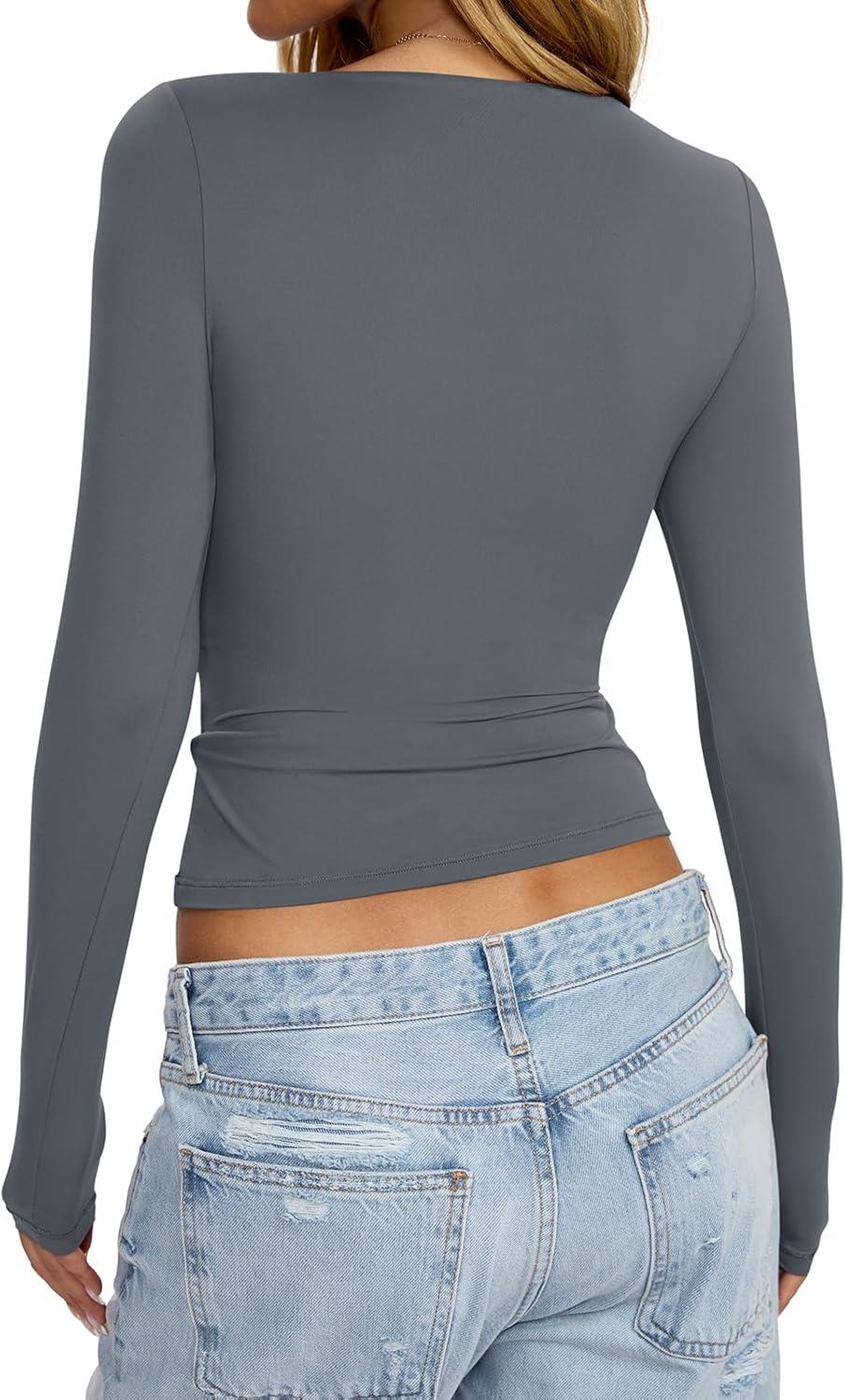 Womens Boat Neck Long Sleeve Shirts Ruched Double Lined Top Fitted Basic Tight Tee Spring Fall Clothes 2025(Gray)