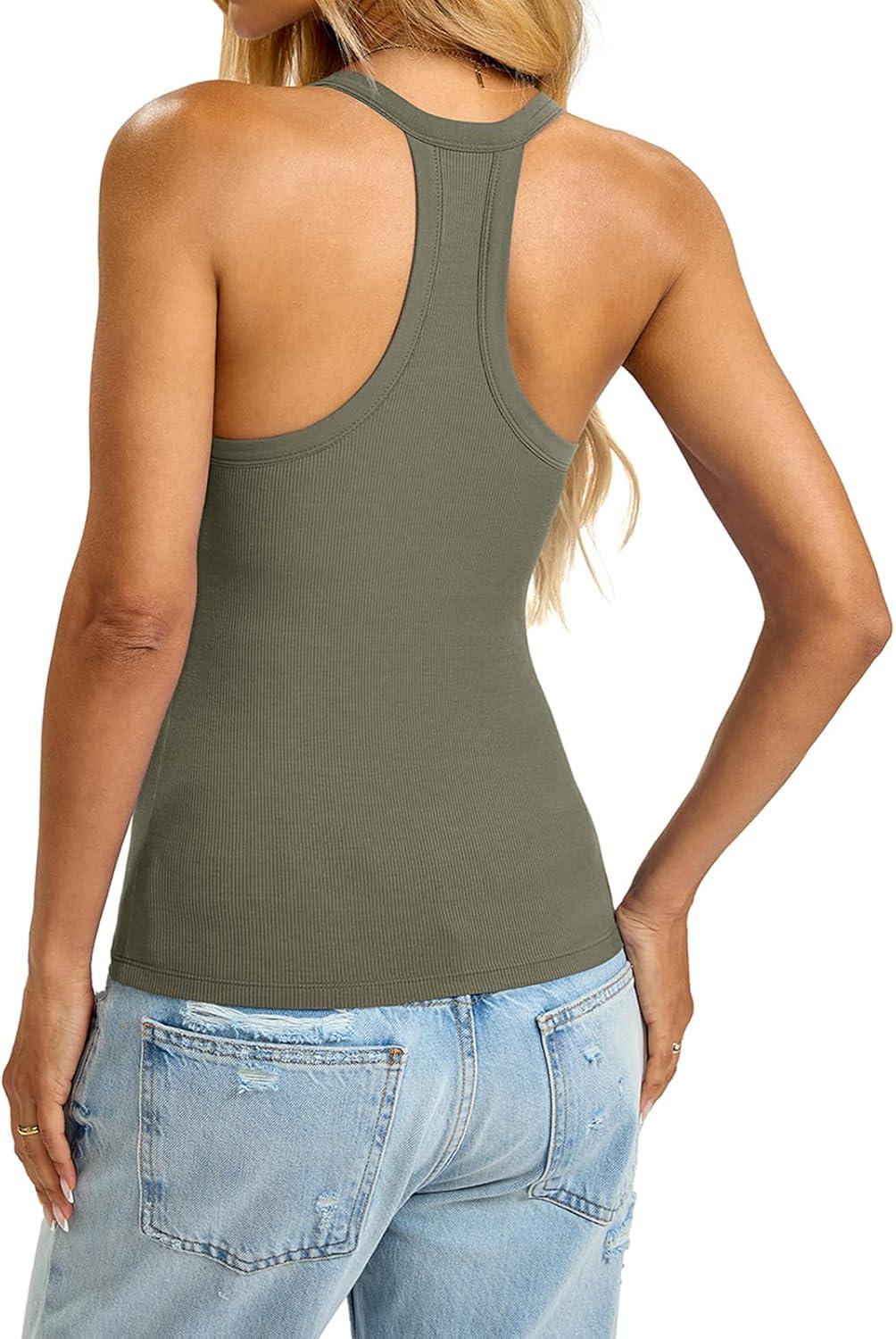 Womens Built in Shelf Bra Racerback Tank Tops Padded Ribbed Halter Strap T Shirts Slim Fitted Sexy V Neck Tee(Army Green)
