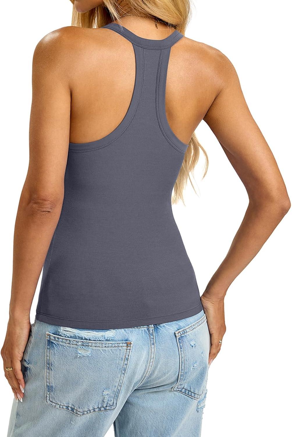 Womens Built in Shelf Bra Racerback Tank Tops Padded Ribbed Halter Strap T Shirts Slim Fitted Sexy V Neck Tee(Dark Gray)