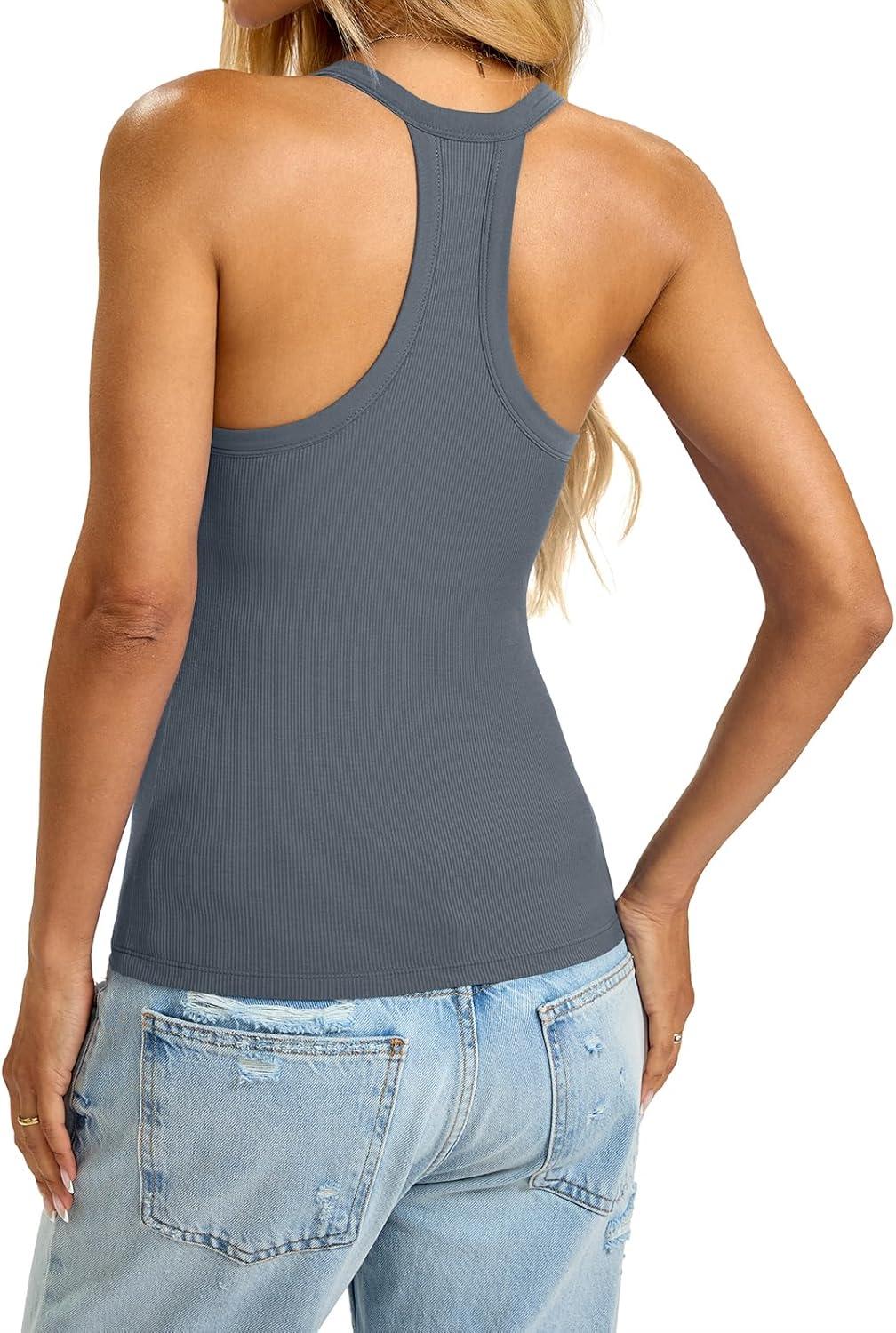 Womens Built in Shelf Bra Racerback Tank Tops Padded Ribbed Halter Strap T Shirts Slim Fitted Sexy V Neck Tee(Dusty Blue)