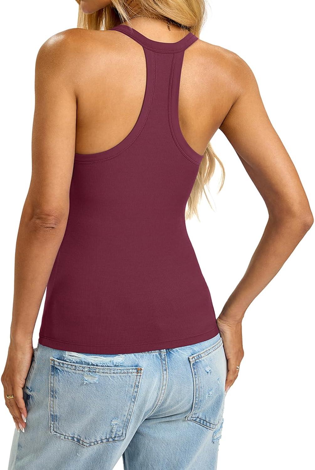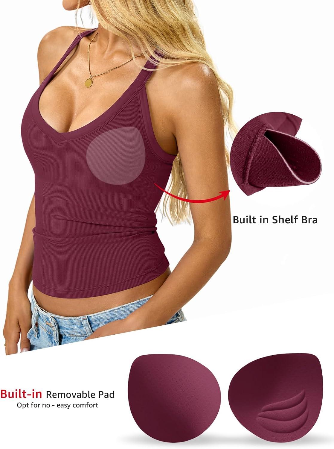 Womens Built in Shelf Bra Racerback Tank Tops Padded Ribbed Halter Strap T Shirts Slim Fitted Sexy V Neck Tee(Wine Red)