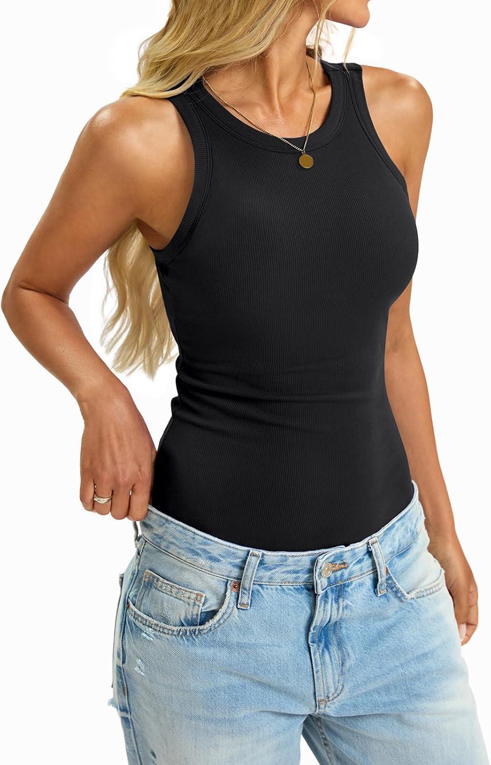Womens Built in Shelf Bra Tank Tops Padded Ribbed High Neck Shirts Slim Fitted Basic Summer Sleeveless Tee(Black)