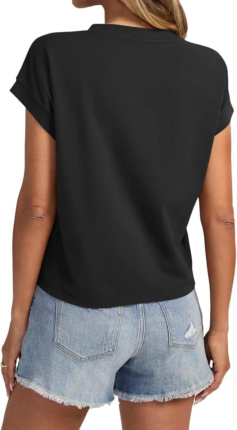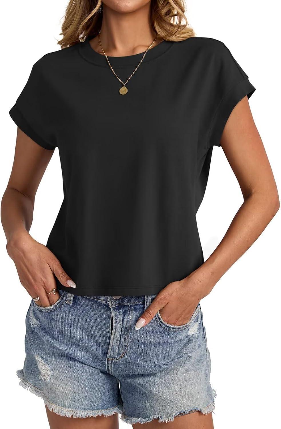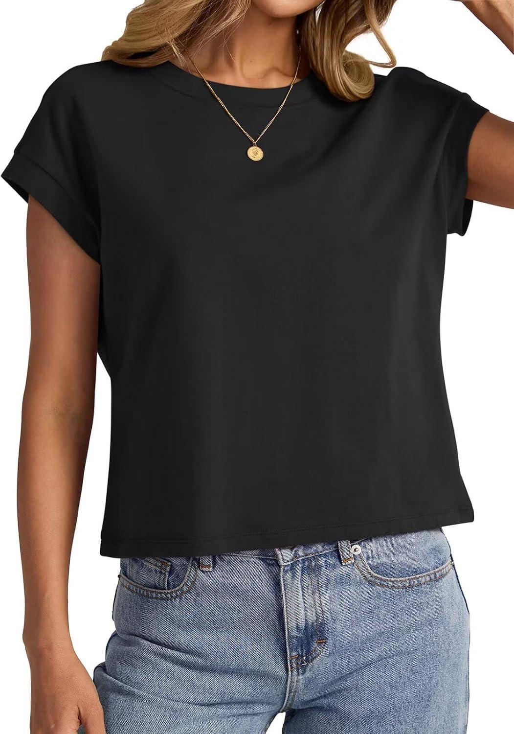 Womens Cap Sleeve Crop Tops Cotton T Shirts Crewneck Loose Fit Short Sleeves Tee Summer Fashion Clothes 2025(A-black)