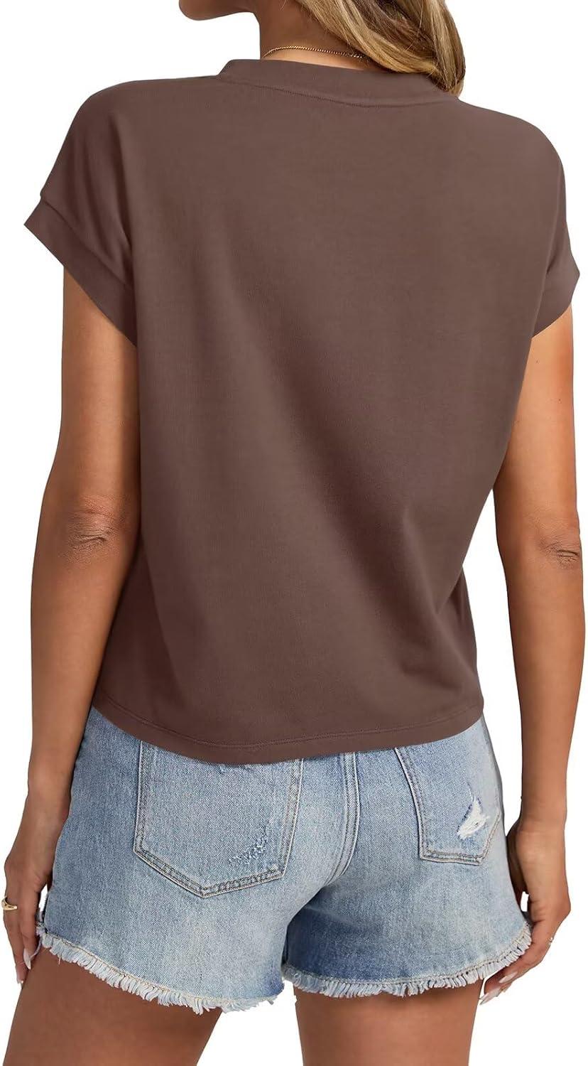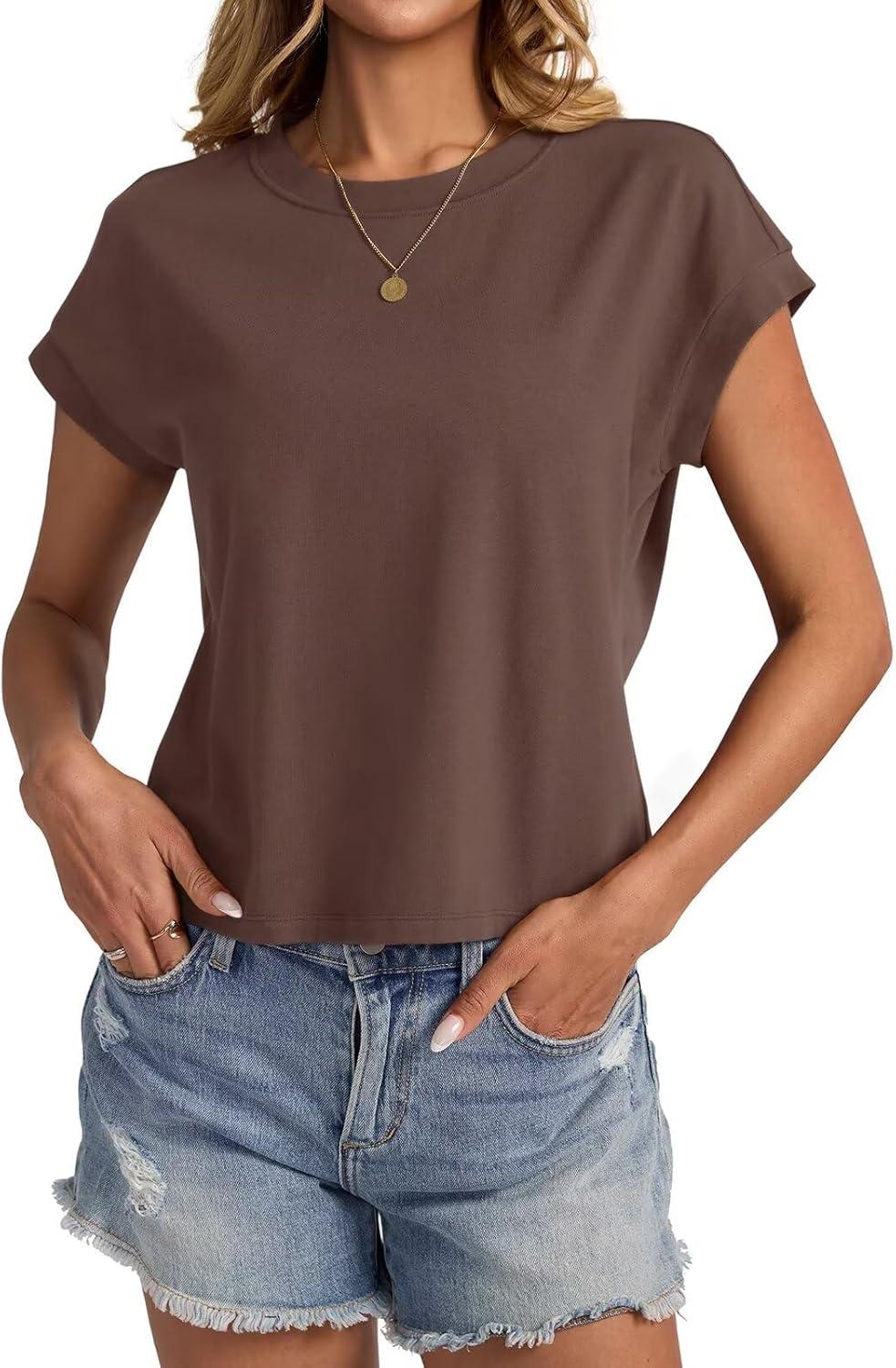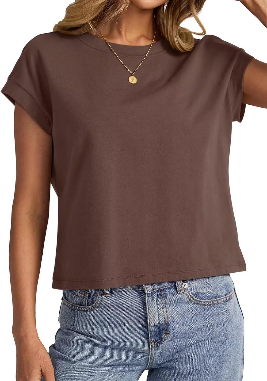 Womens Cap Sleeve Crop Tops Cotton T Shirts Crewneck Loose Fit Short Sleeves Tee Summer Fashion Clothes 2025(A-brown)