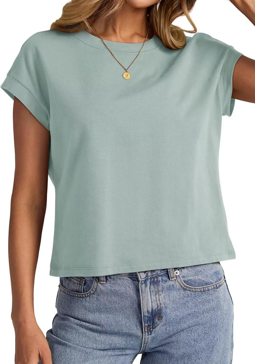 Womens Cap Sleeve Crop Tops Cotton T Shirts Crewneck Loose Fit Short Sleeves Tee Summer Fashion Clothes 2025(A-green)
