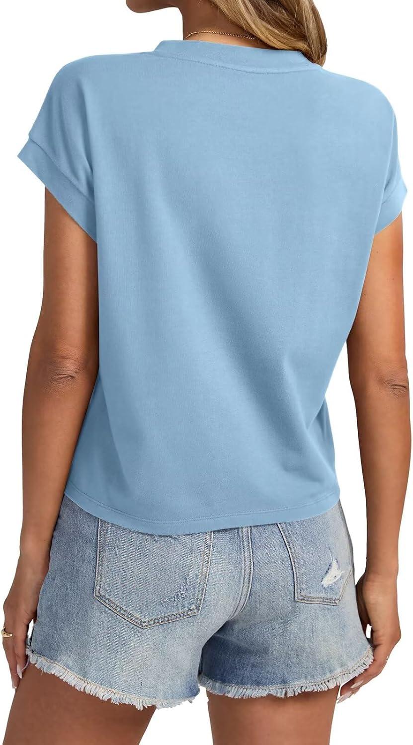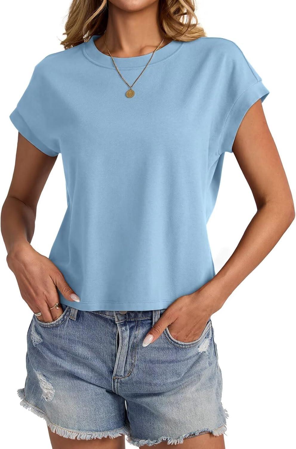 Womens Cap Sleeve Crop Tops Cotton T Shirts Crewneck Loose Fit Short Sleeves Tee Summer Fashion Clothes 2025(A-light Blue)