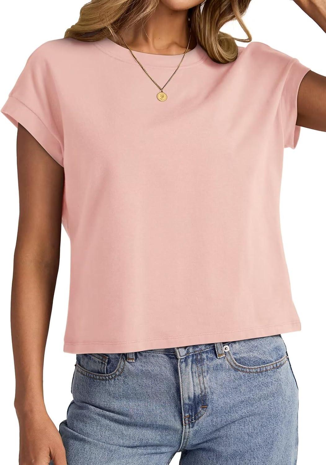 Womens Cap Sleeve Crop Tops Cotton T Shirts Crewneck Loose Fit Short Sleeves Tee Summer Fashion Clothes 2025(A-light Pink)