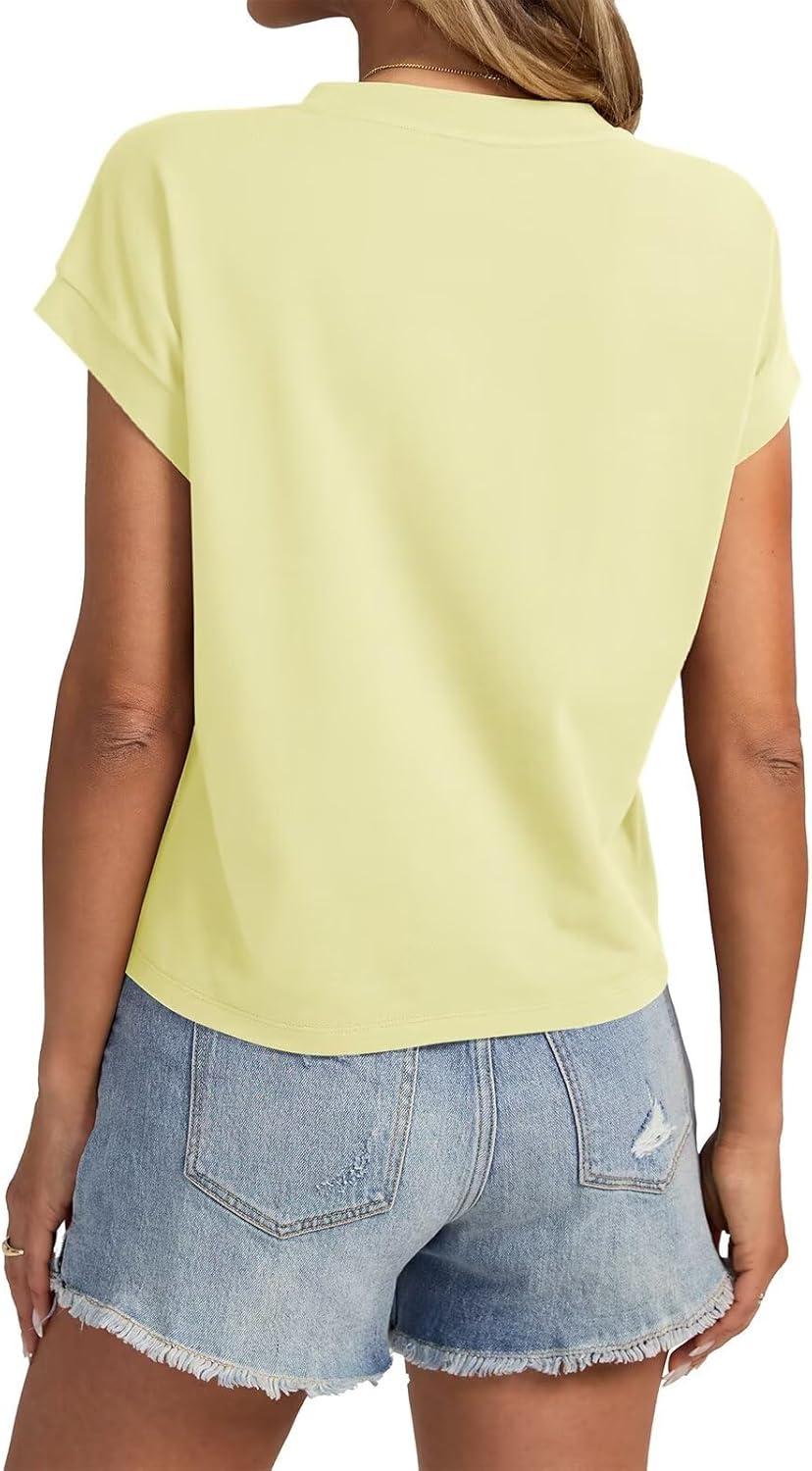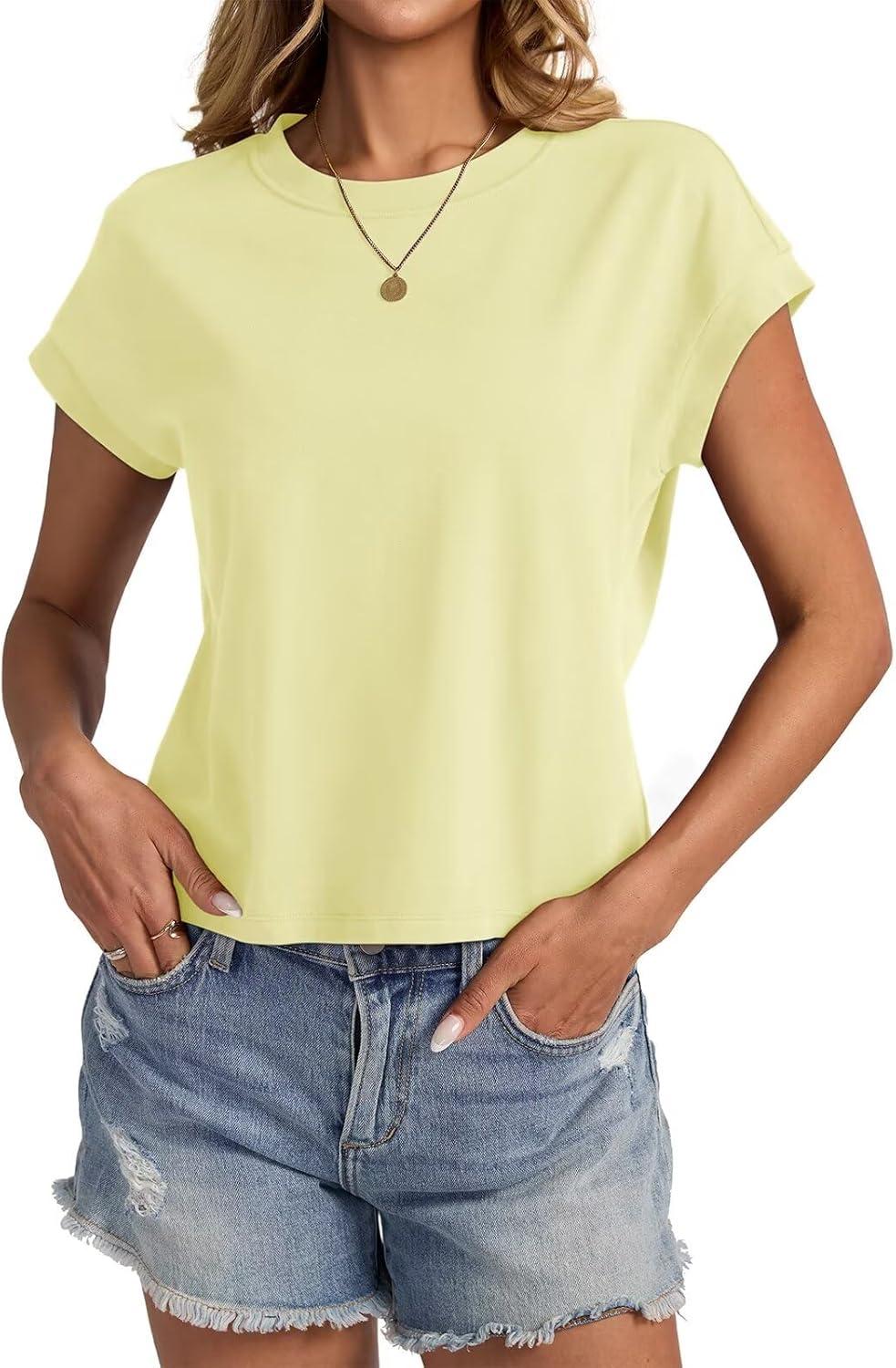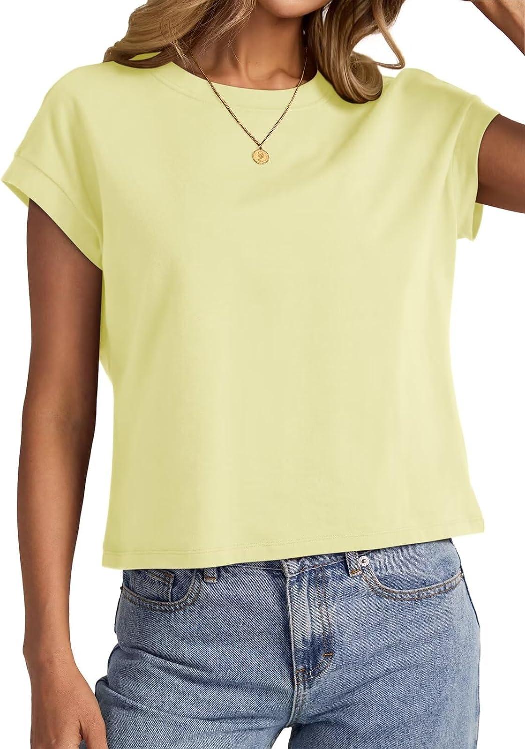 Womens Cap Sleeve Crop Tops Cotton T Shirts Crewneck Loose Fit Short Sleeves Tee Summer Fashion Clothes 2025(A-light Yellow)