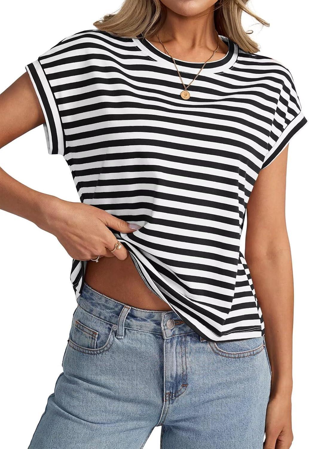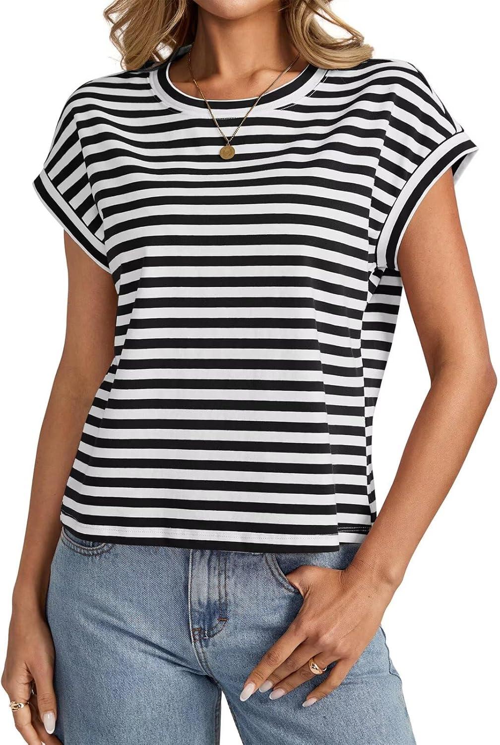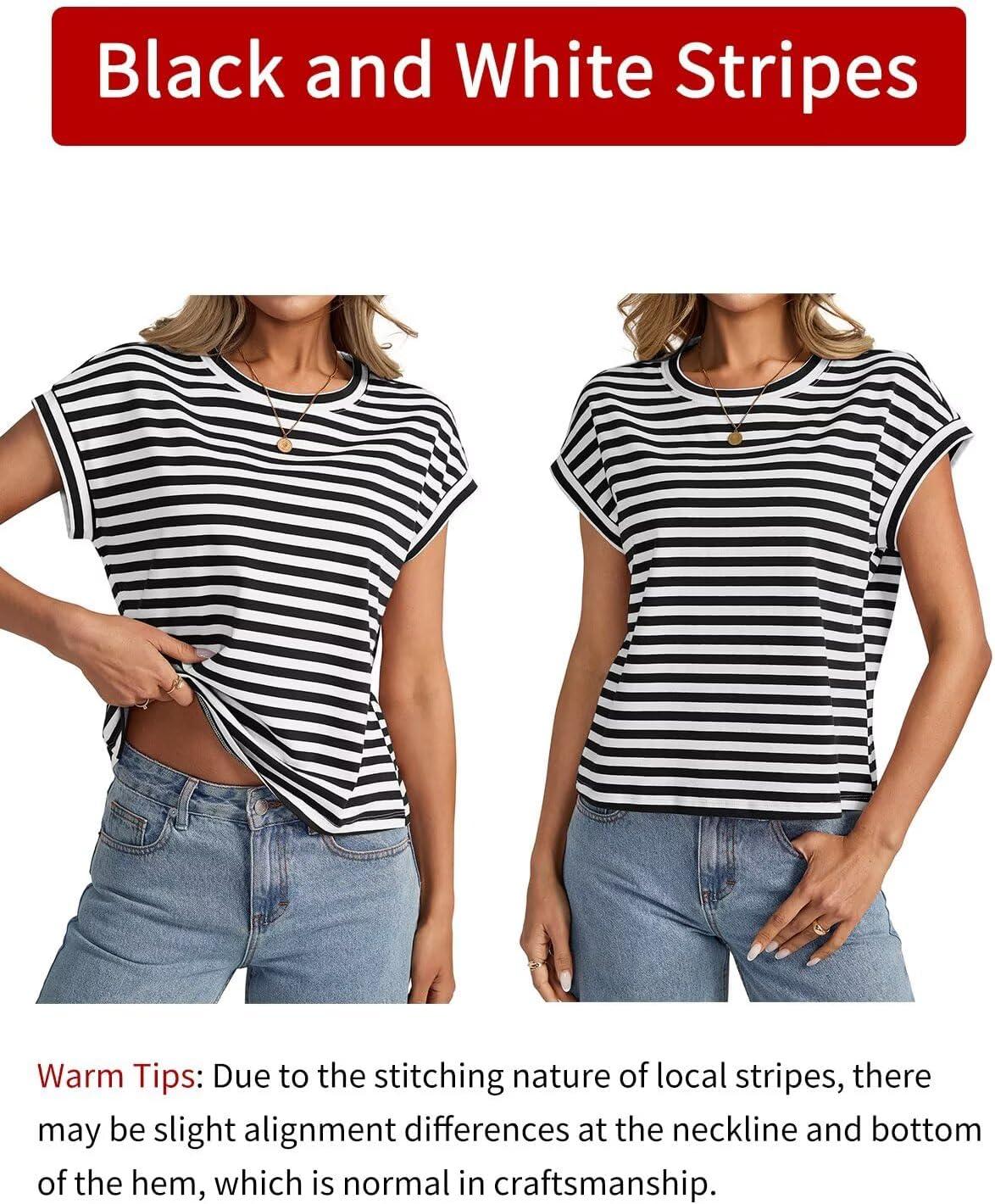 Womens Cap Sleeve Crop Tops Cotton T Shirts Crewneck Loose Fit Short Sleeves Tee Summer Fashion Clothes 2025(B-black White)