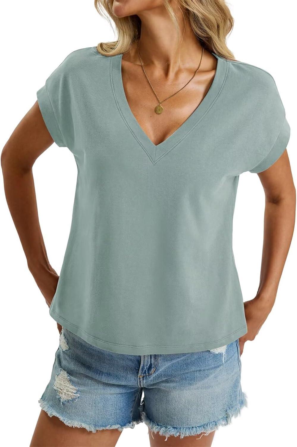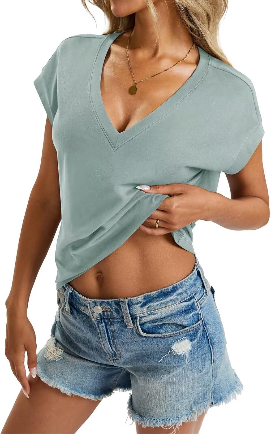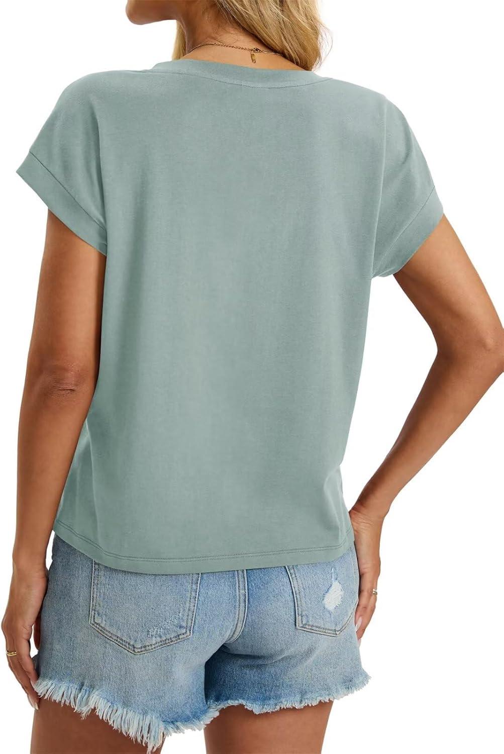 Womens Cap Sleeve Crop Tops Cotton V Neck T Shirt Boxy Loose Fit Short Sleeves Tee Summer Fashion Clothes 2025(Green)