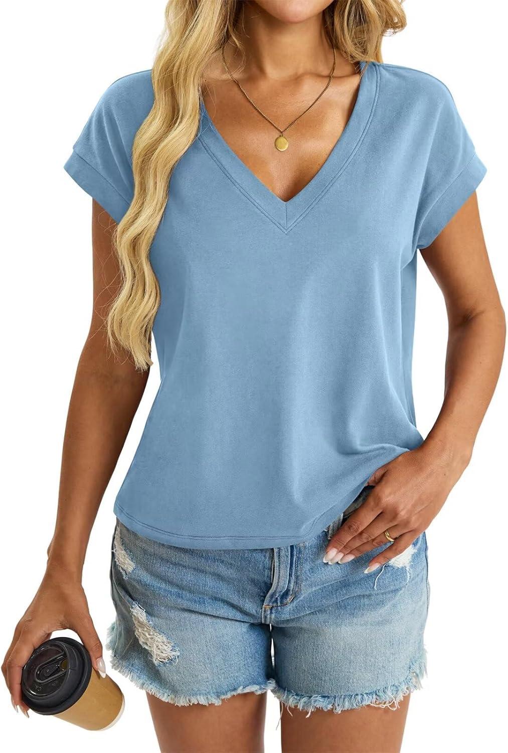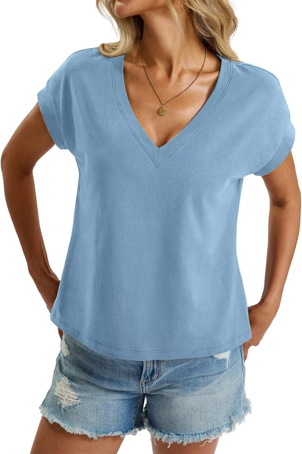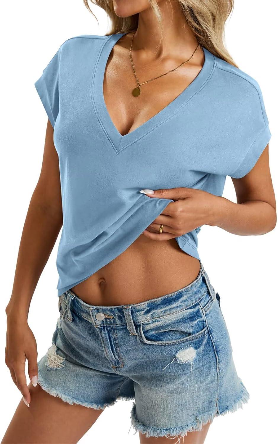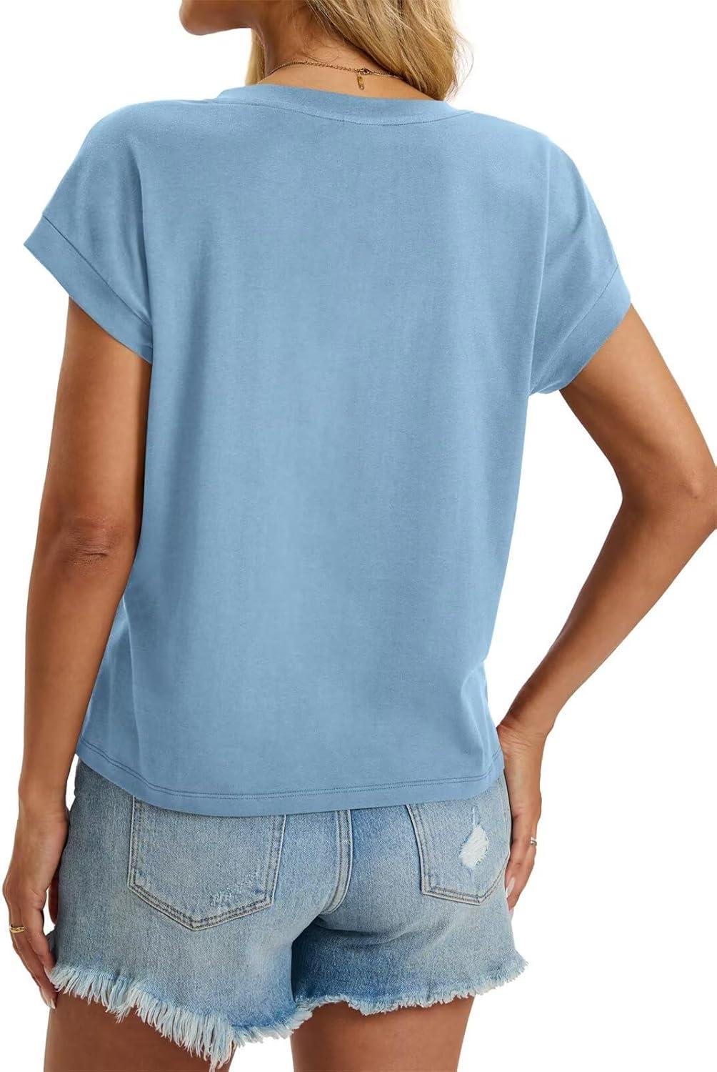 Womens Cap Sleeve Crop Tops Cotton V Neck T Shirt Boxy Loose Fit Short Sleeves Tee Summer Fashion Clothes 2025(Light Blue)