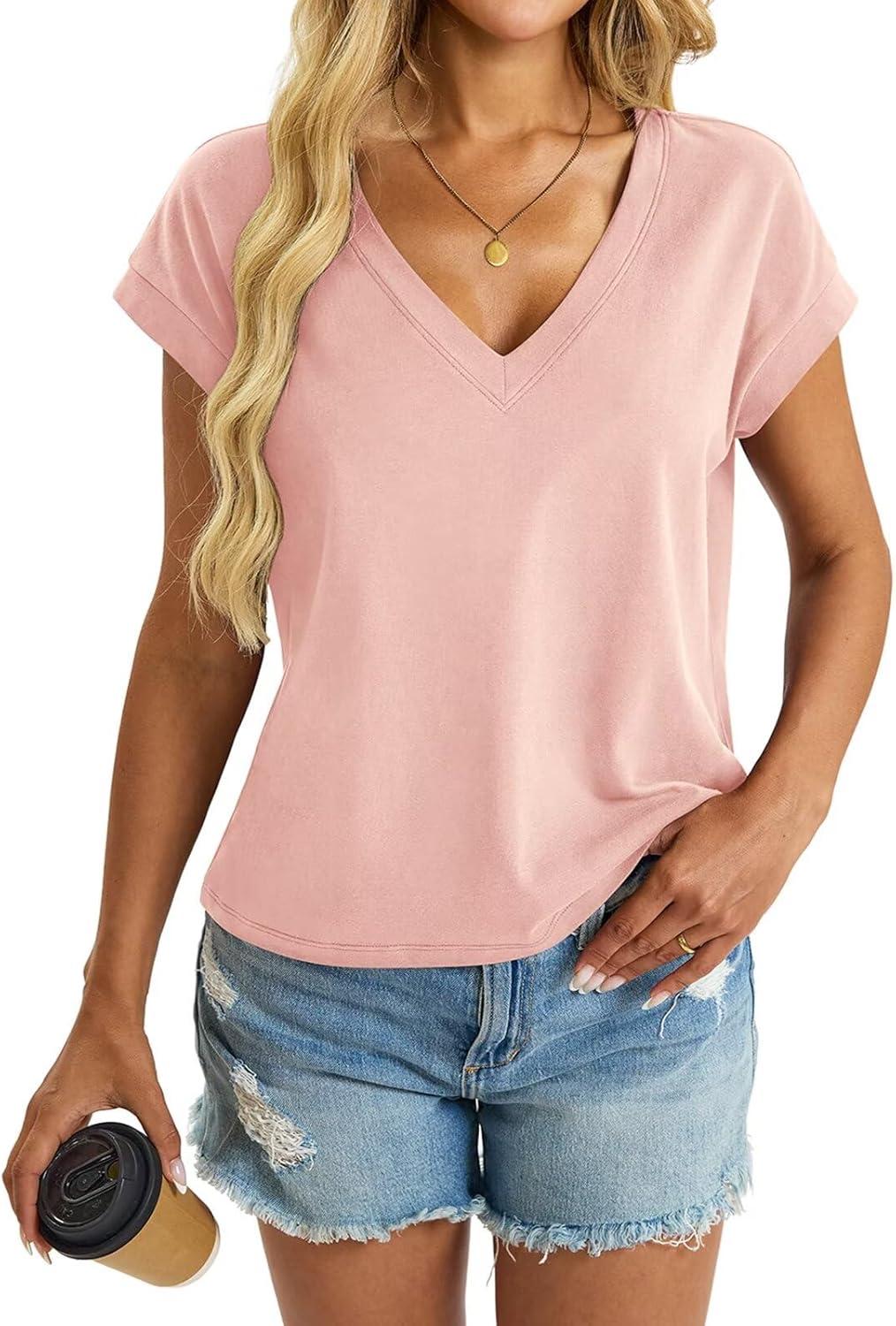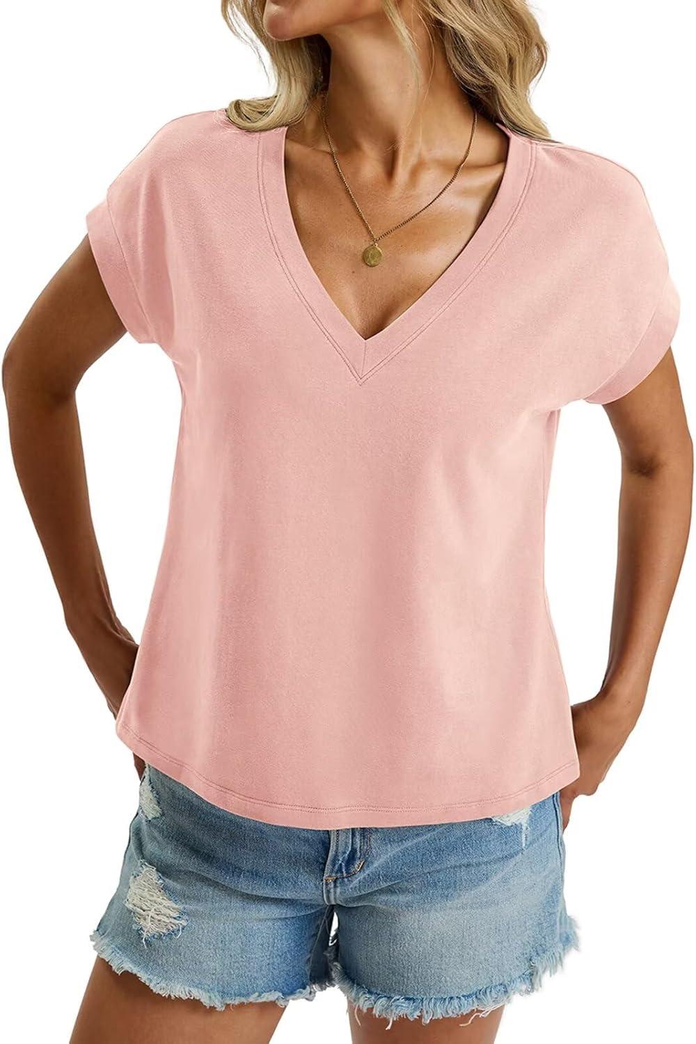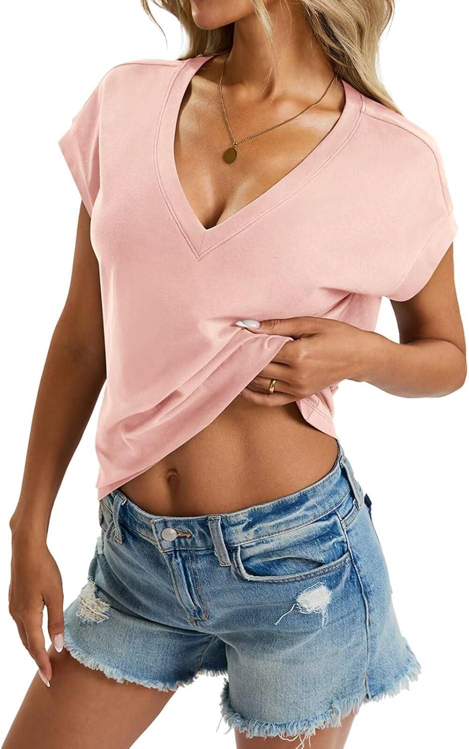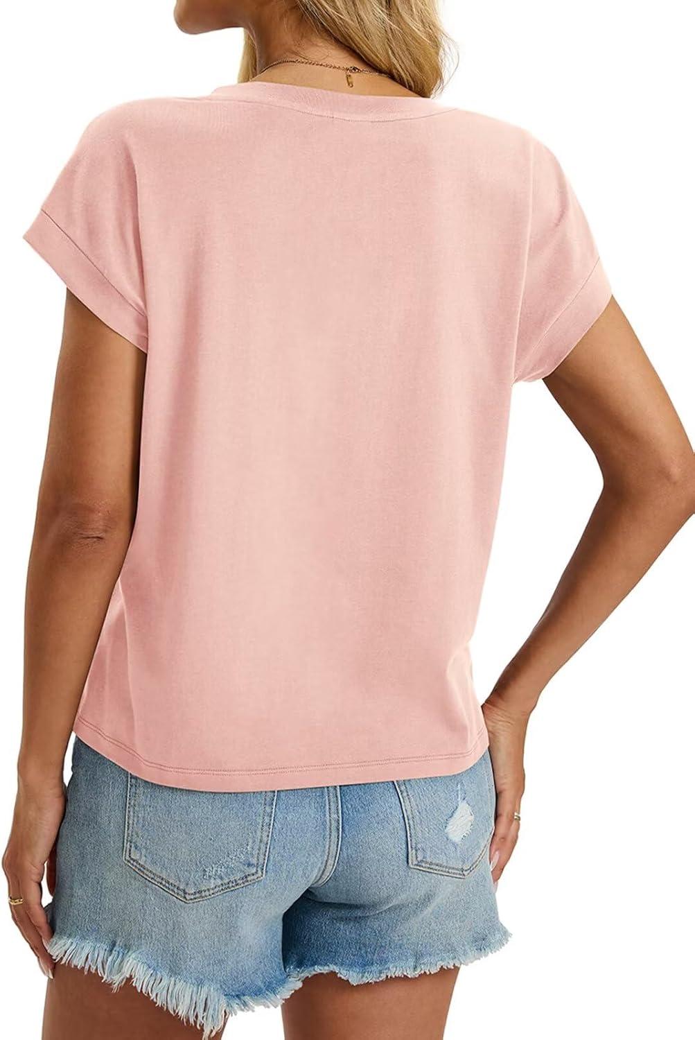 Womens Cap Sleeve Crop Tops Cotton V Neck T Shirt Boxy Loose Fit Short Sleeves Tee Summer Fashion Clothes 2025(Light Pink)