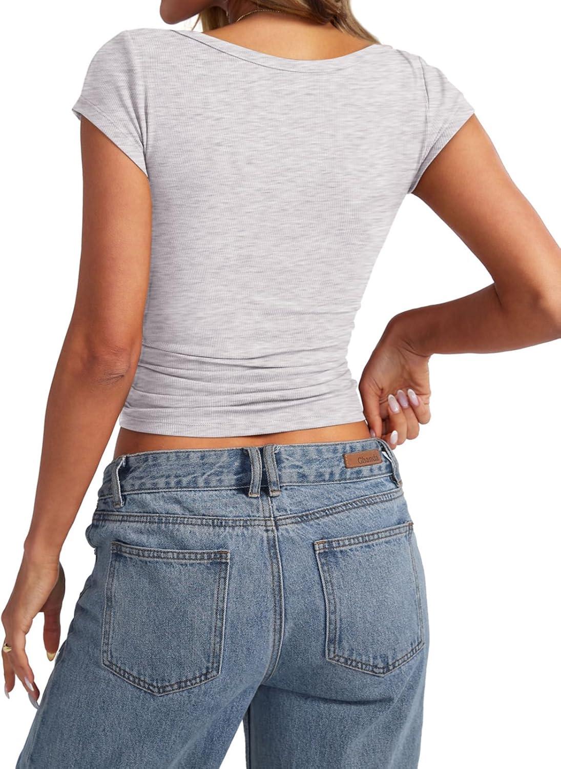 Womens Cap Sleeve Ribbed Tops Boat Neck Short Sleeve Slim Fitted Shirts Basic Going Out Summer Outfits Clothes(Grey)