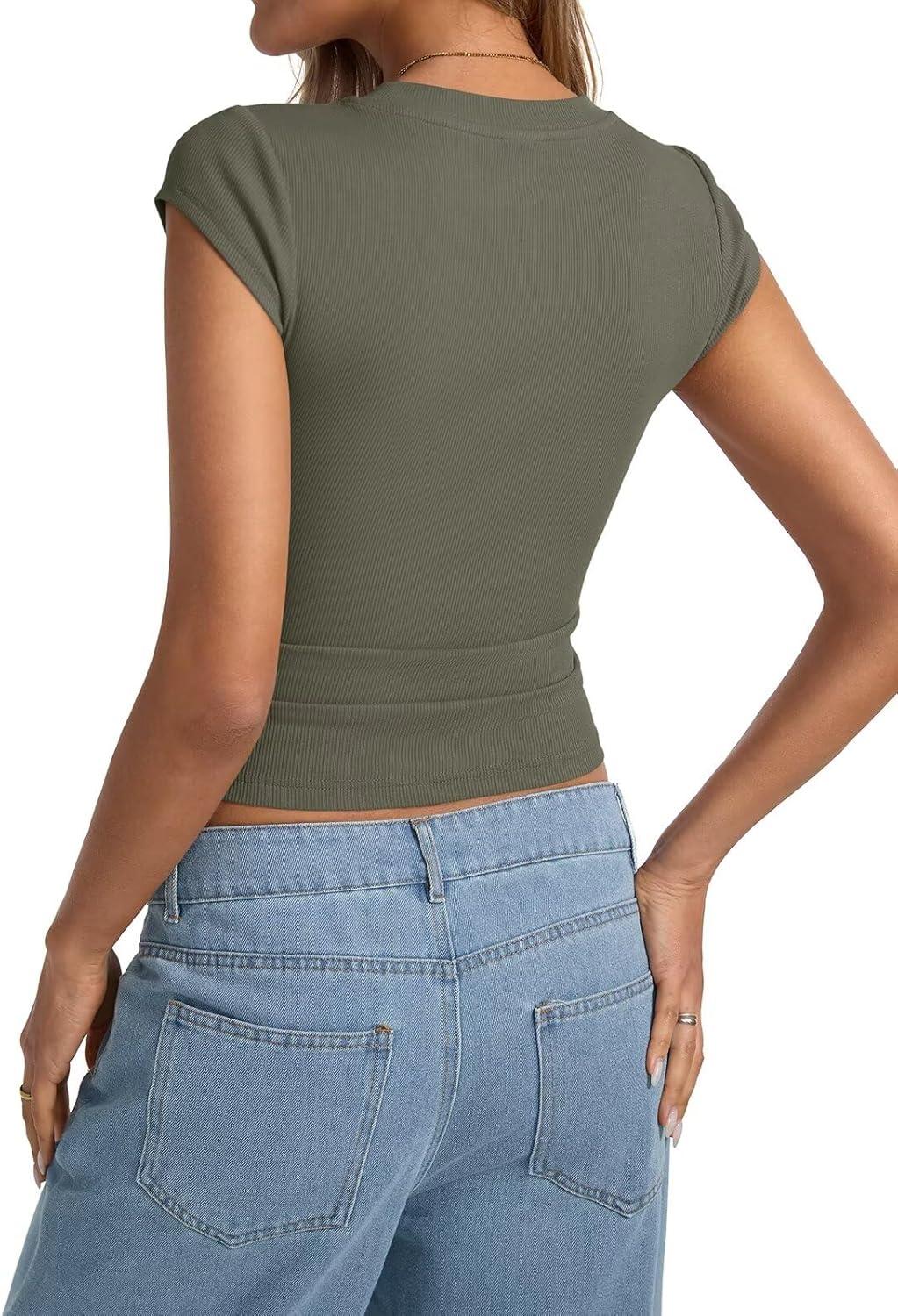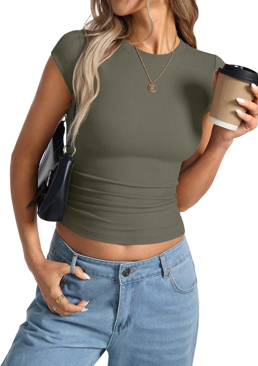 Womens Cap Sleeve Tops Summer Crew Neck Short Sleeve Shirts Slim Fit Basic Ribbed Tops Y2K 2025 Going Out Crop(Army Green)