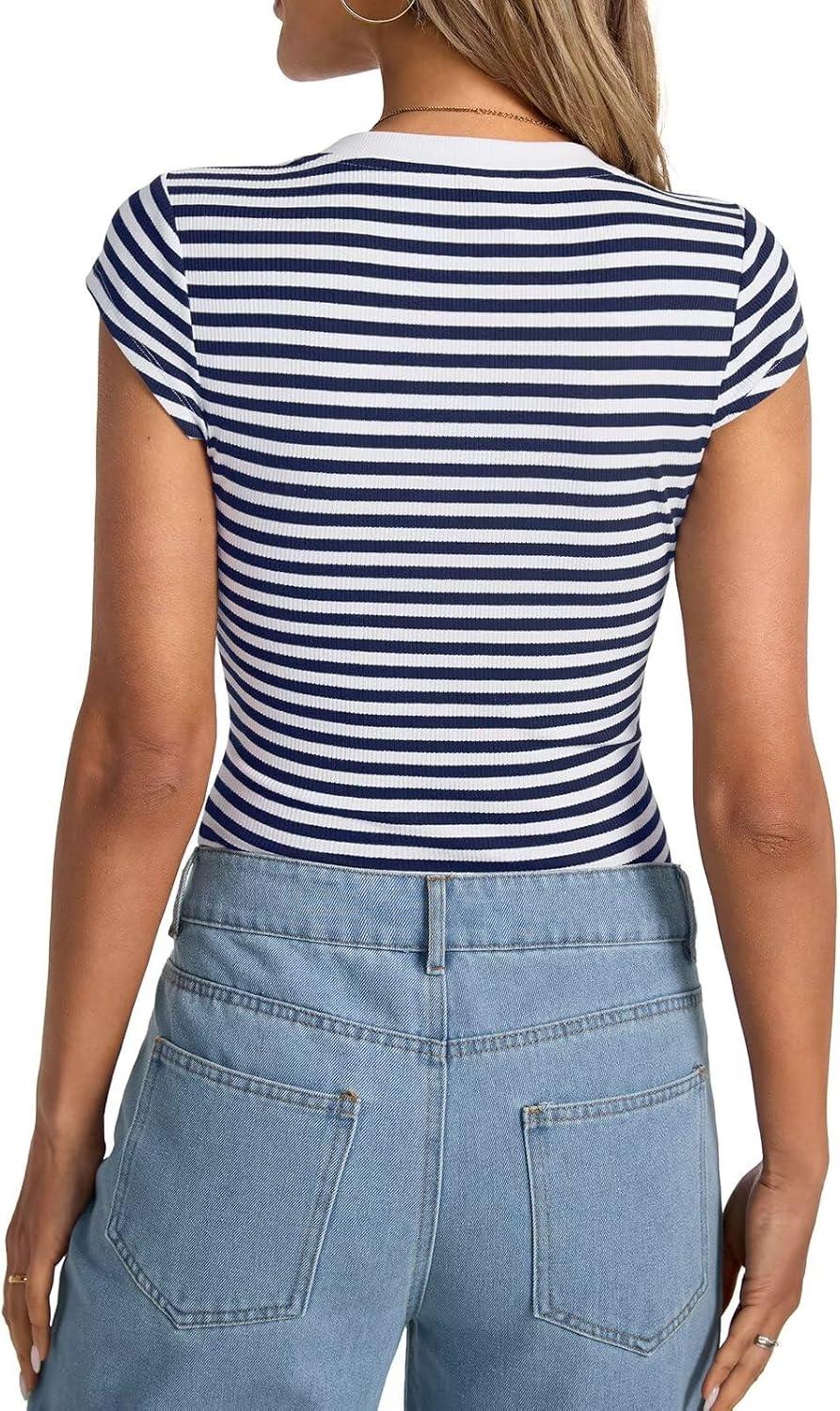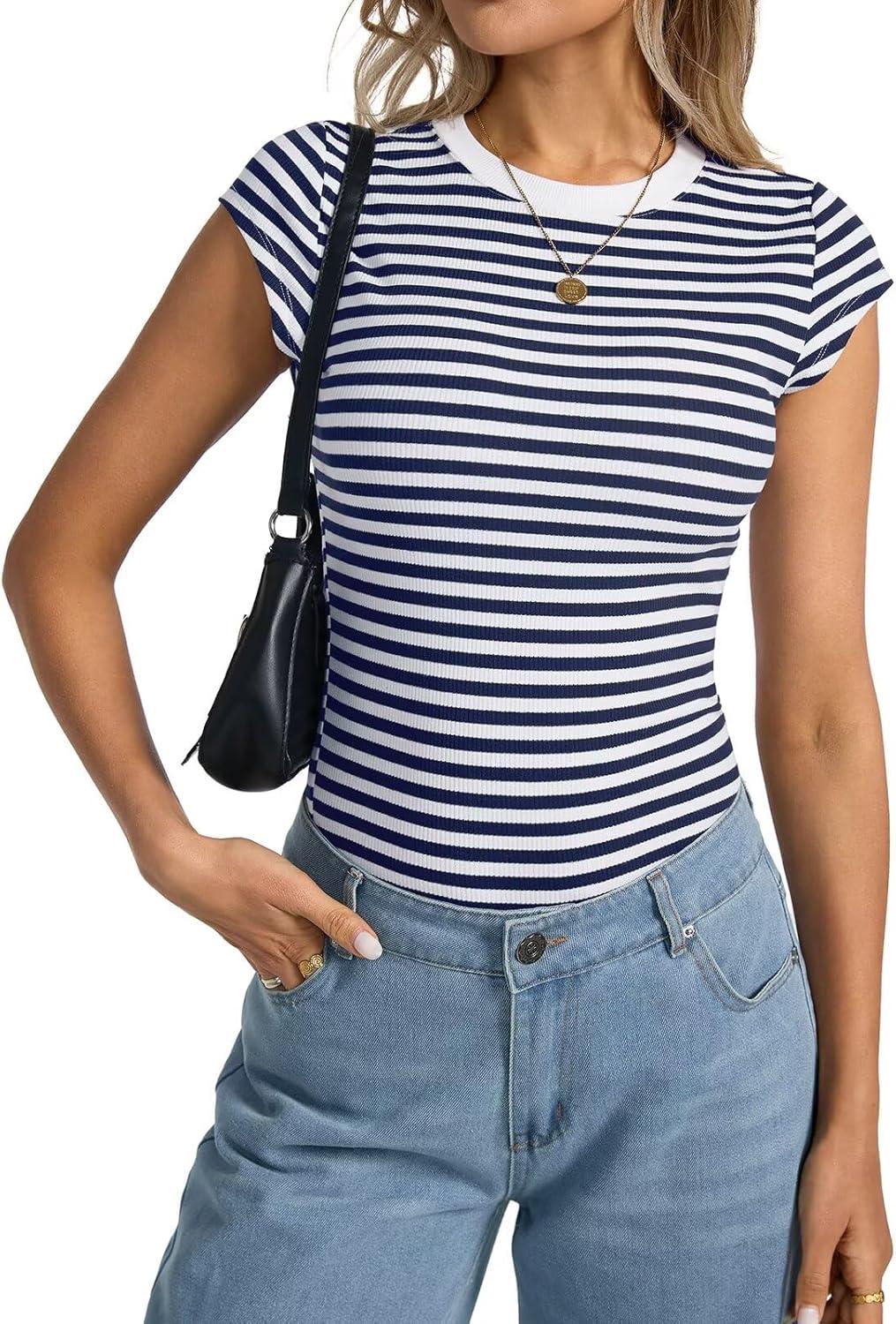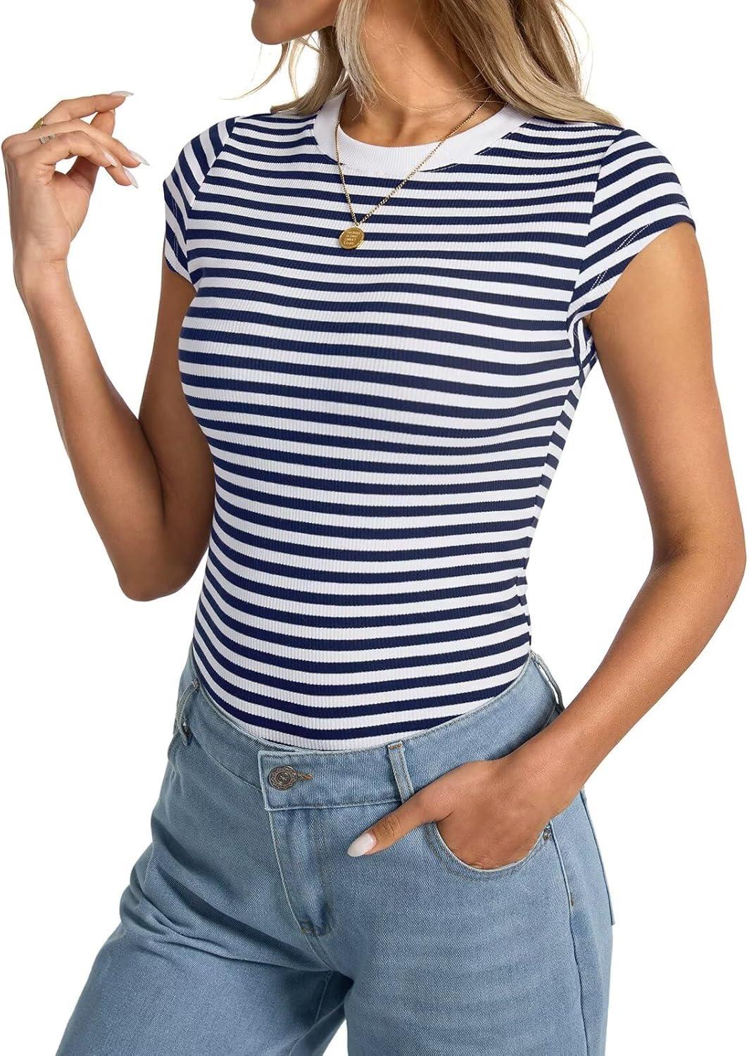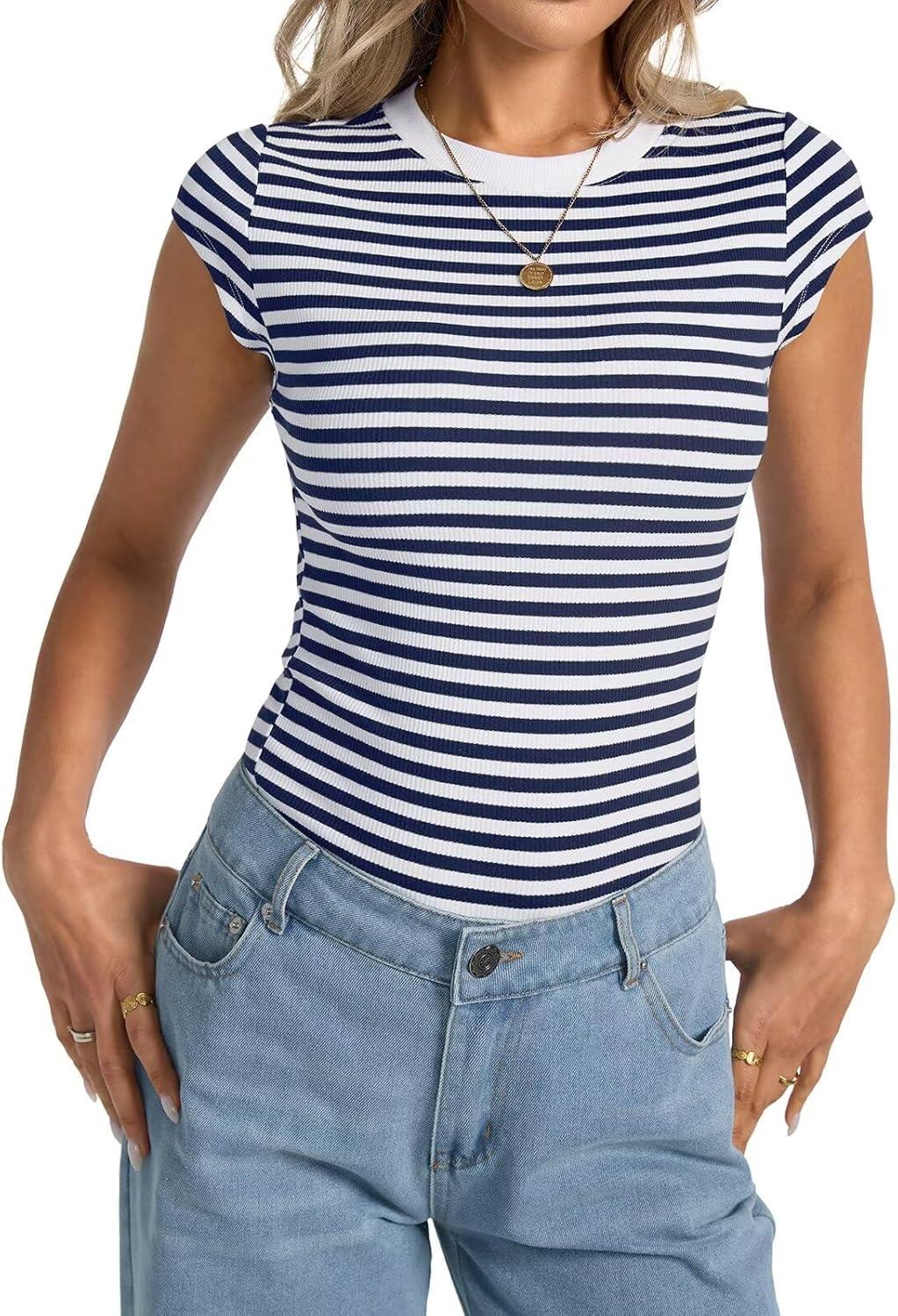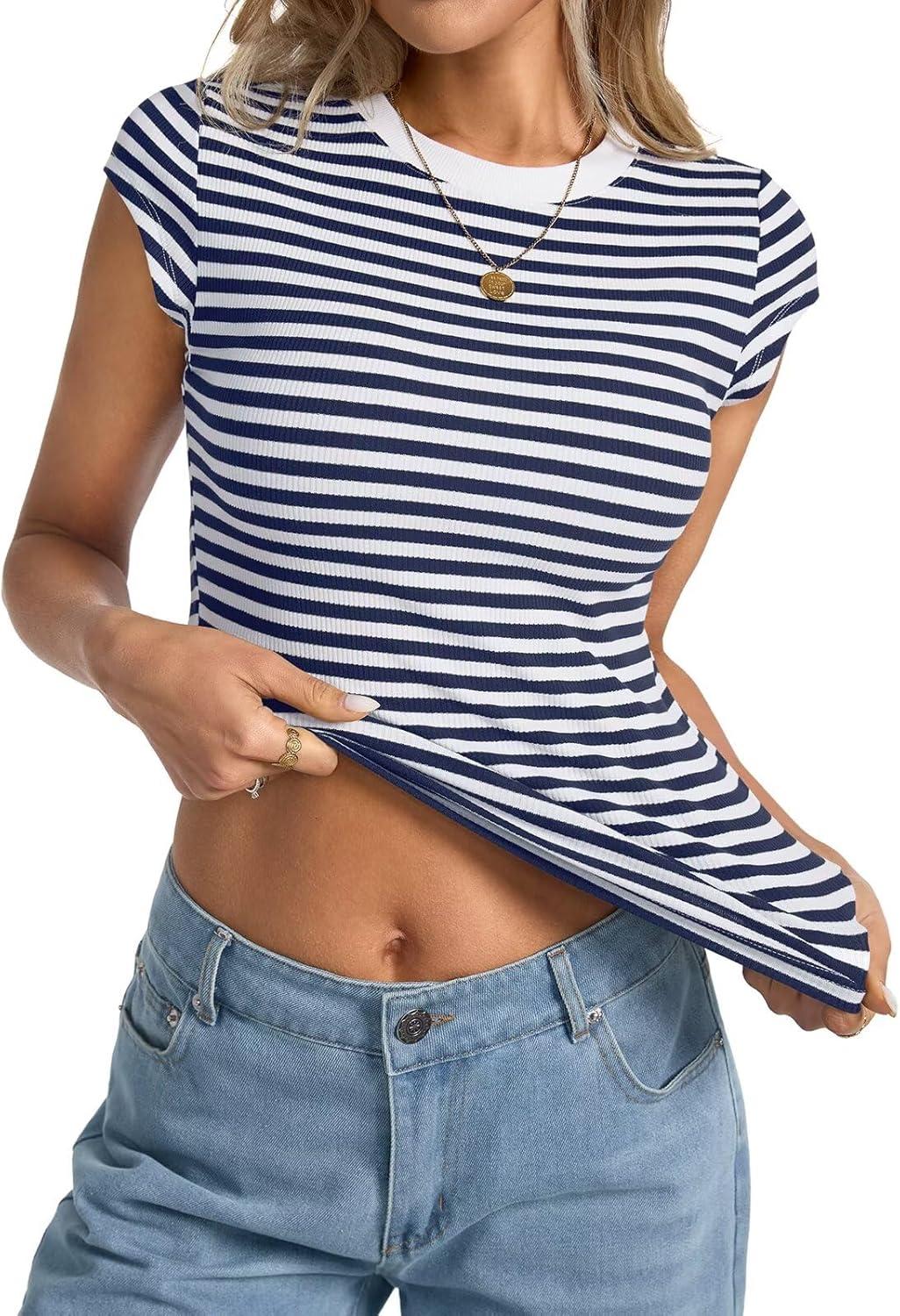 Womens Cap Sleeve Tops Summer Crew Neck Short Sleeve Shirts Slim Fit Basic Ribbed Tops Y2K 2025 Going Out Crop(Navy Blue Stripe)