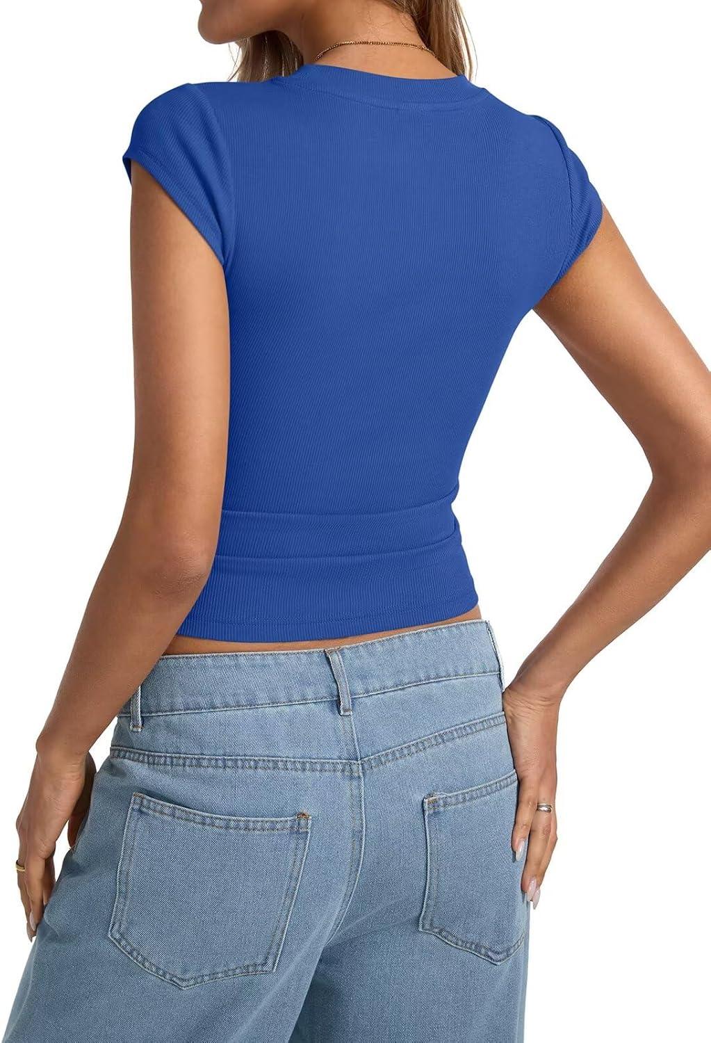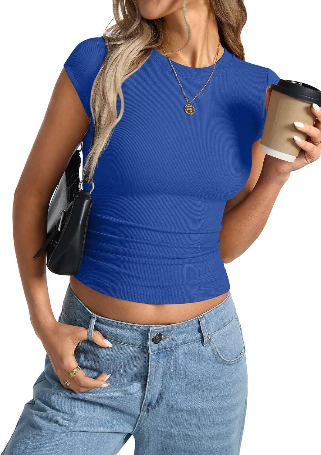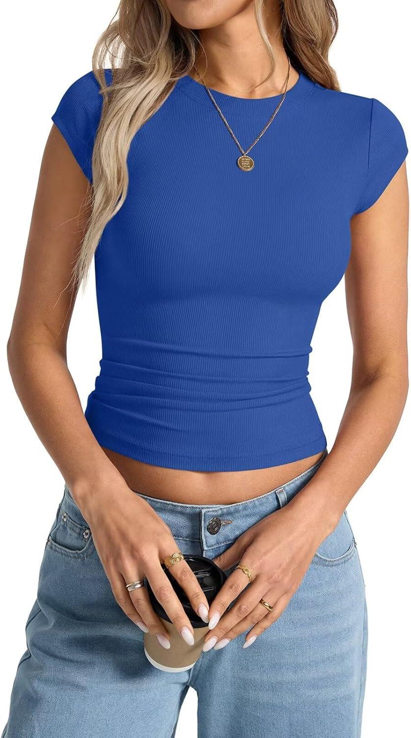 Womens Cap Sleeve Tops Summer Crew Neck Short Sleeve Shirts Slim Fit Basic Ribbed Tops Y2K 2025 Going Out Crop(Royal Blue)