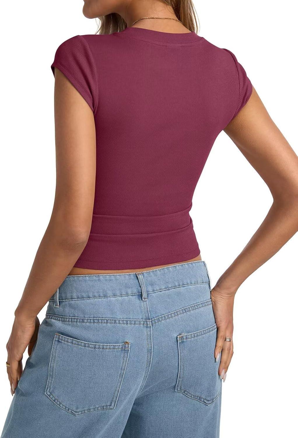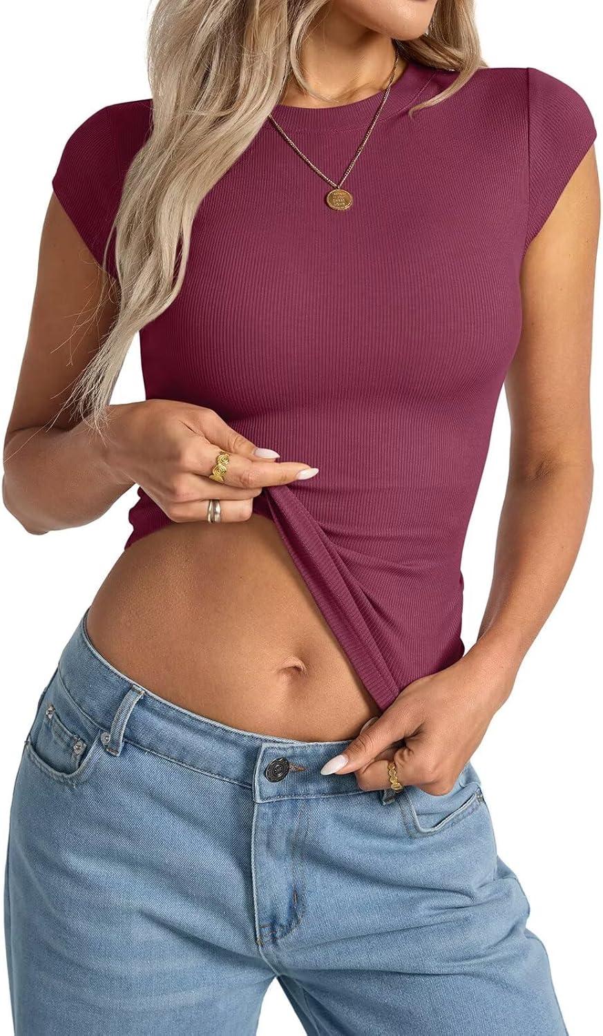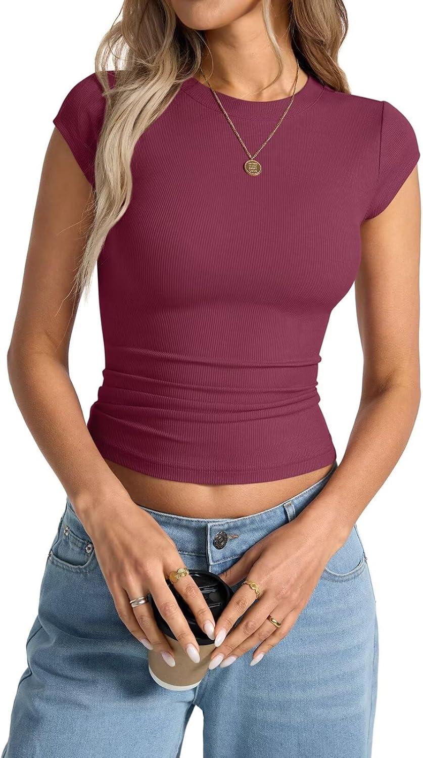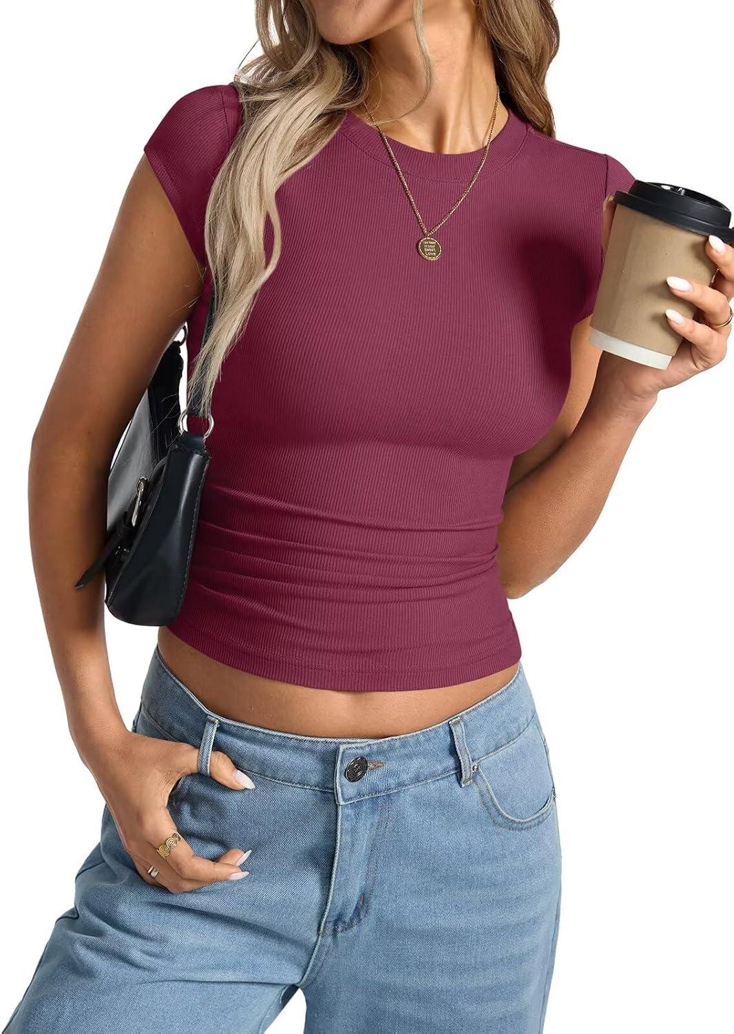Womens Cap Sleeve Tops Summer Crew Neck Short Sleeve Shirts Slim Fit Basic Ribbed Tops Y2K 2025 Going Out Crop(Wine Red)