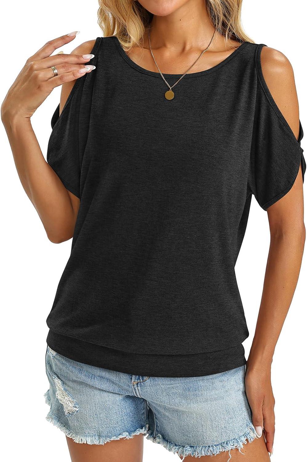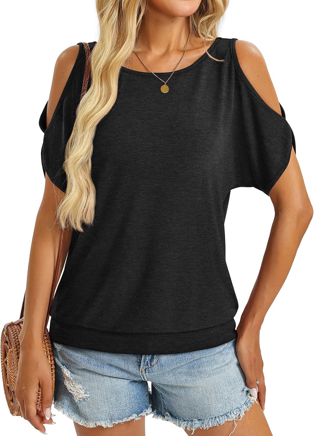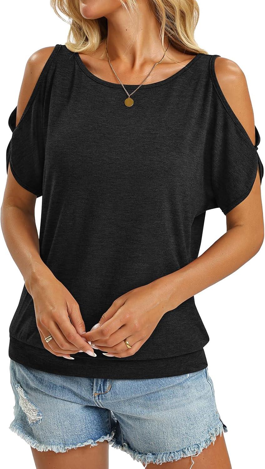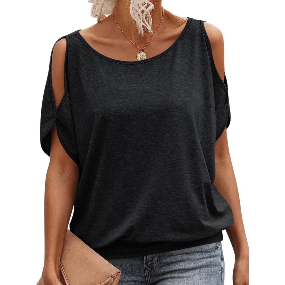 Womens Cold Shoulder Tops Banded Bottom Boat Neck T Shirts Summer Sexy Casual Loose Fit Clothes 2025(Black)