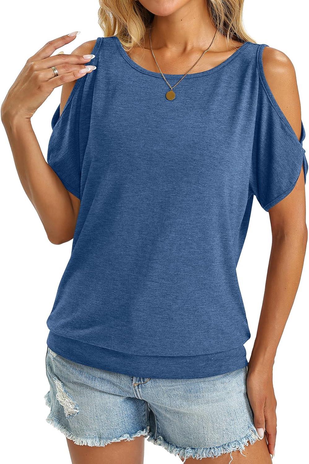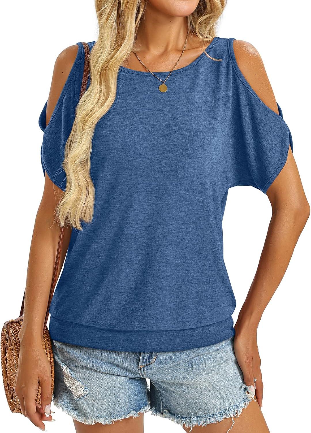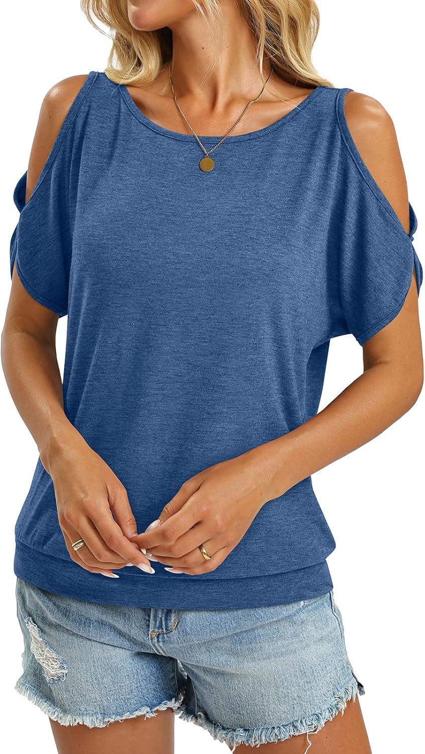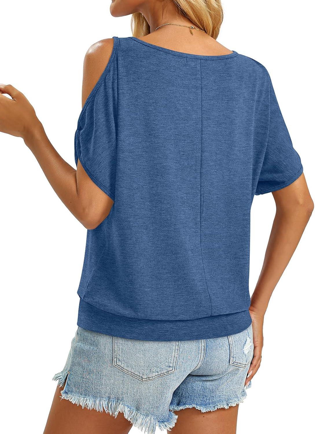 Womens Cold Shoulder Tops Banded Bottom Boat Neck T Shirts Summer Sexy Casual Loose Fit Clothes 2025(Blue)