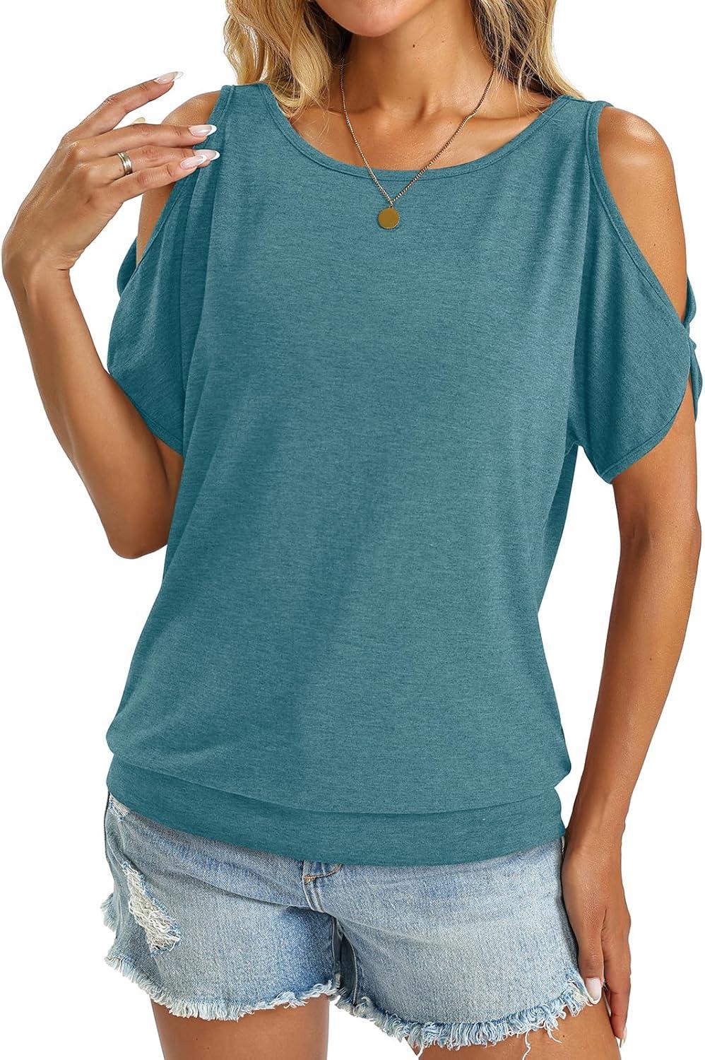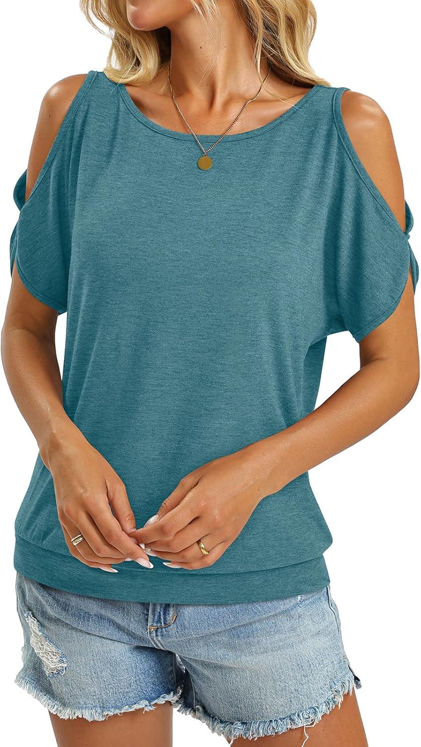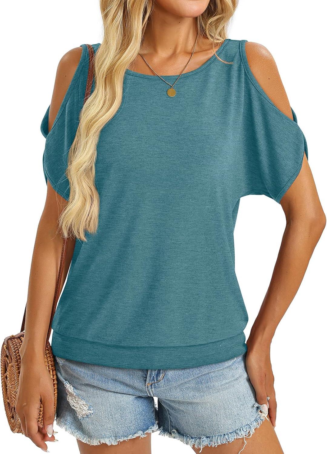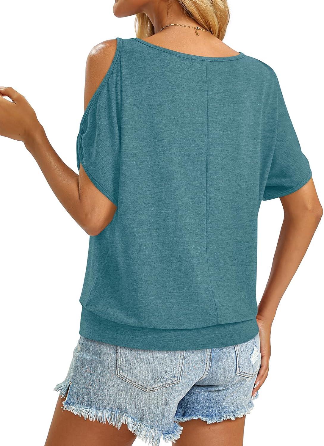 Womens Cold Shoulder Tops Banded Bottom Boat Neck T Shirts Summer Sexy Casual Loose Fit Clothes 2025(Teal Blue)