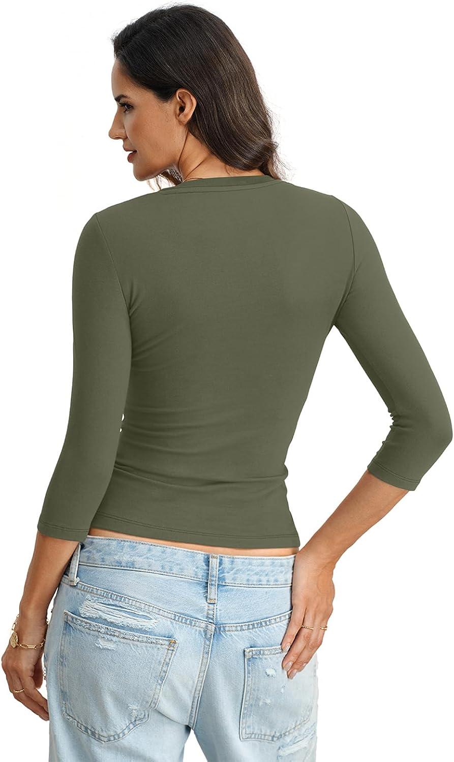 Womens Cotton 3/4 Length Sleeve Tops Crew Neck Slim Fit Shirts Basic Going Out Tops Casual Spring Fashion 2026(Army Green)