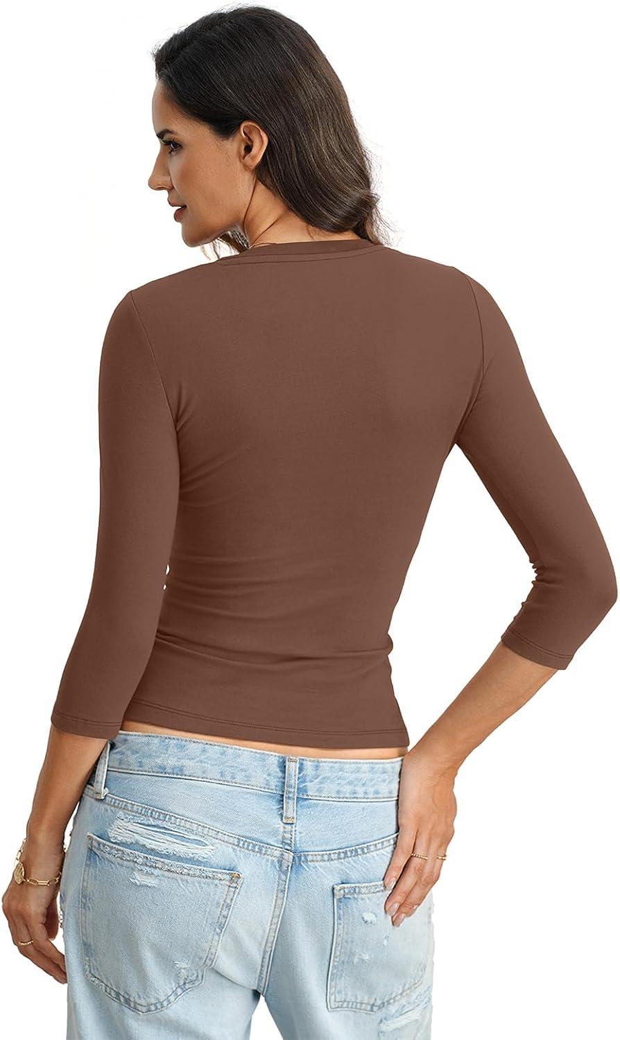 Womens Cotton 3/4 Length Sleeve Tops Crew Neck Slim Fit Shirts Basic Going Out Tops Casual Spring Fashion 2026(Brown)
