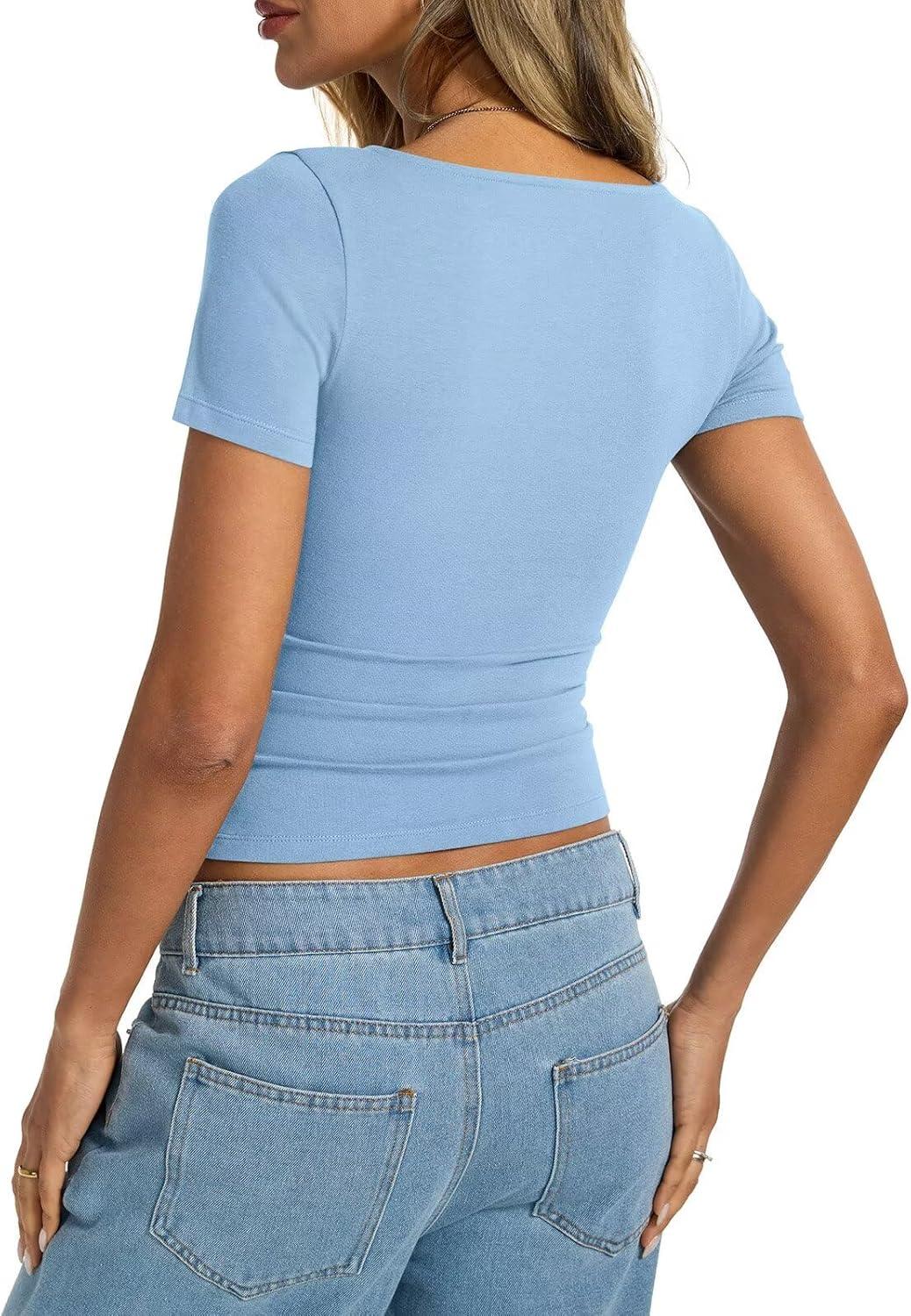 Womens Cotton Boat Neck Short Sleeve Shirts Summer Crop Tops Basic Going Out Tee Fashion Y2K Outfits 2025(Baby Blue)