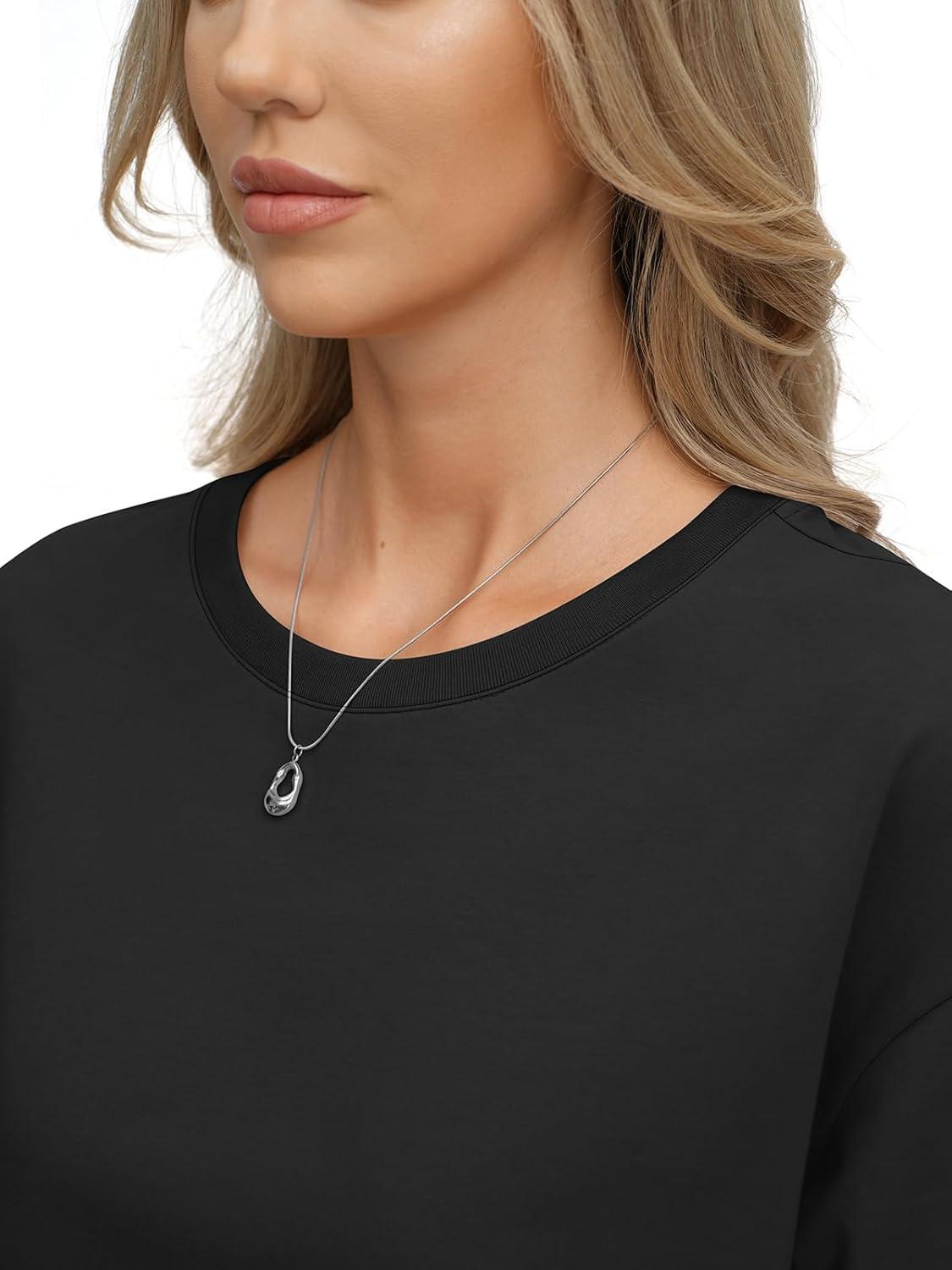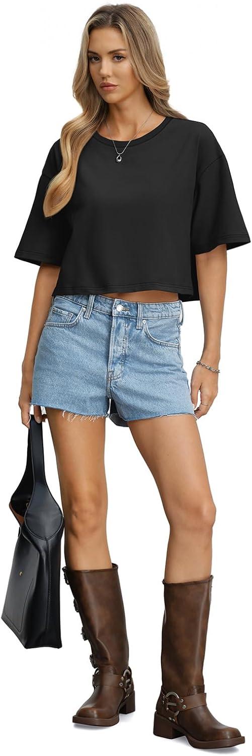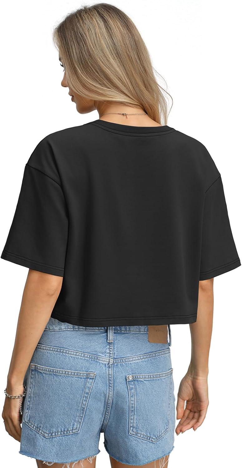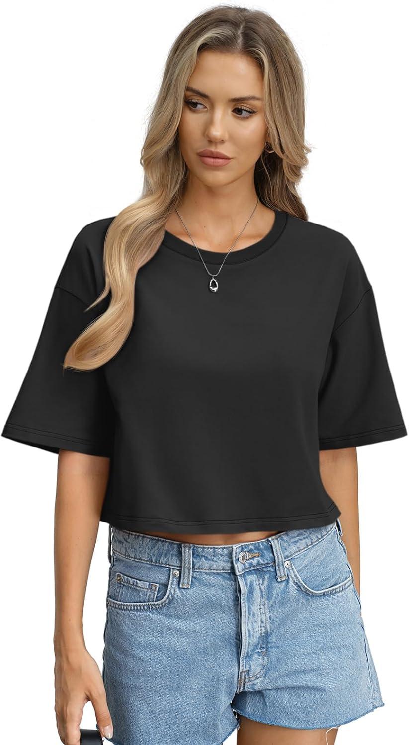 Womens Cotton Boxy Crop Tops Drop Shoulder Loose Fit T-Shirts Trendy Crew Neck Basic Tees Yoga Casual Clothes(Black)