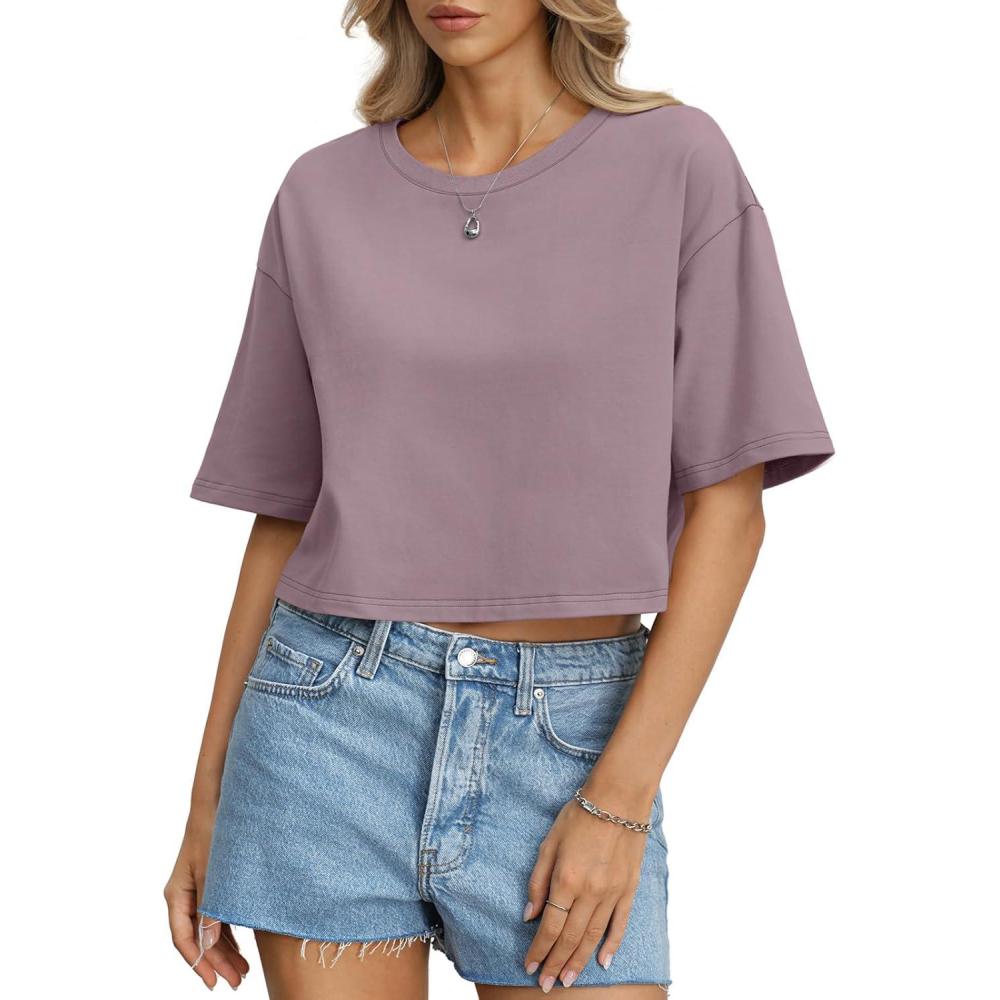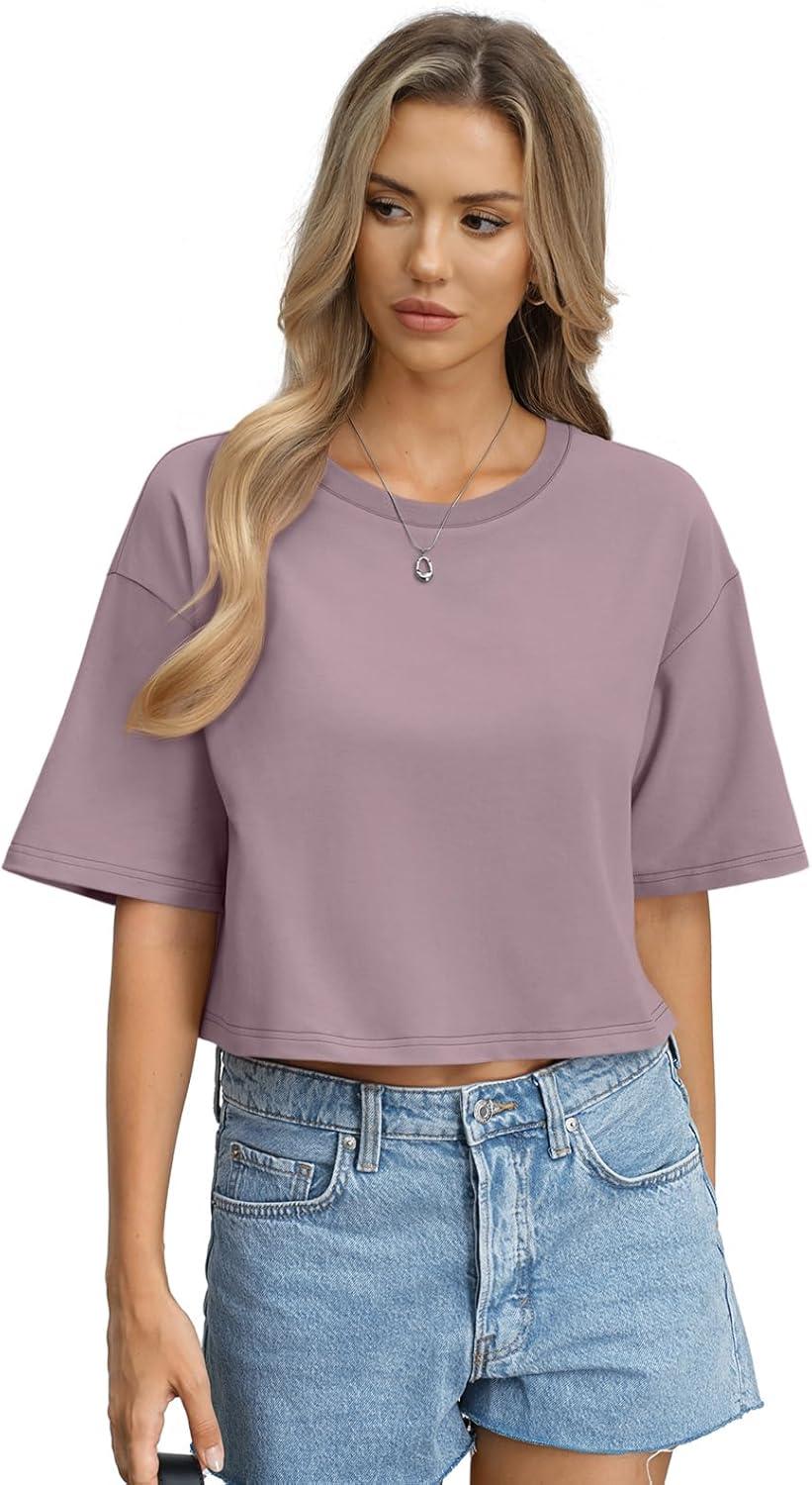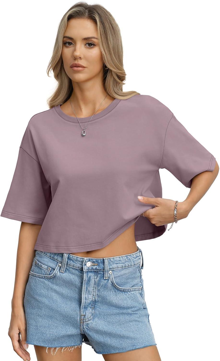 Womens Cotton Boxy Crop Tops Drop Shoulder Loose Fit T-Shirts Trendy Crew Neck Basic Tees Yoga Casual Clothes(Purple)