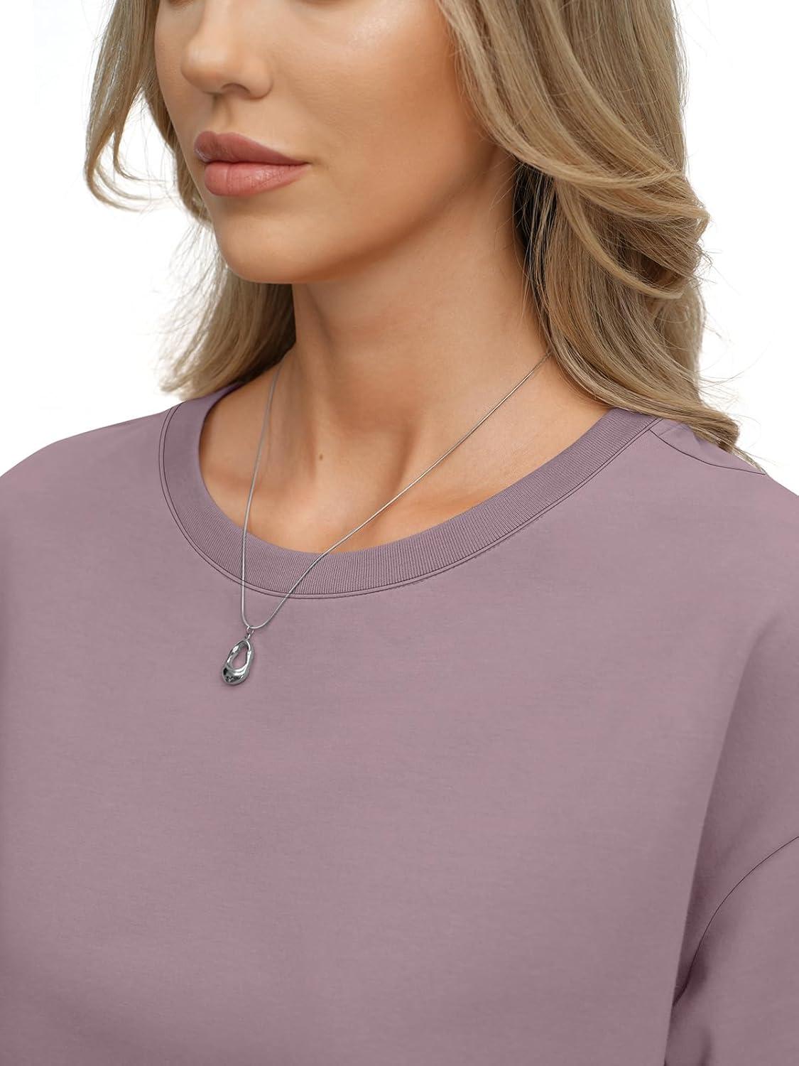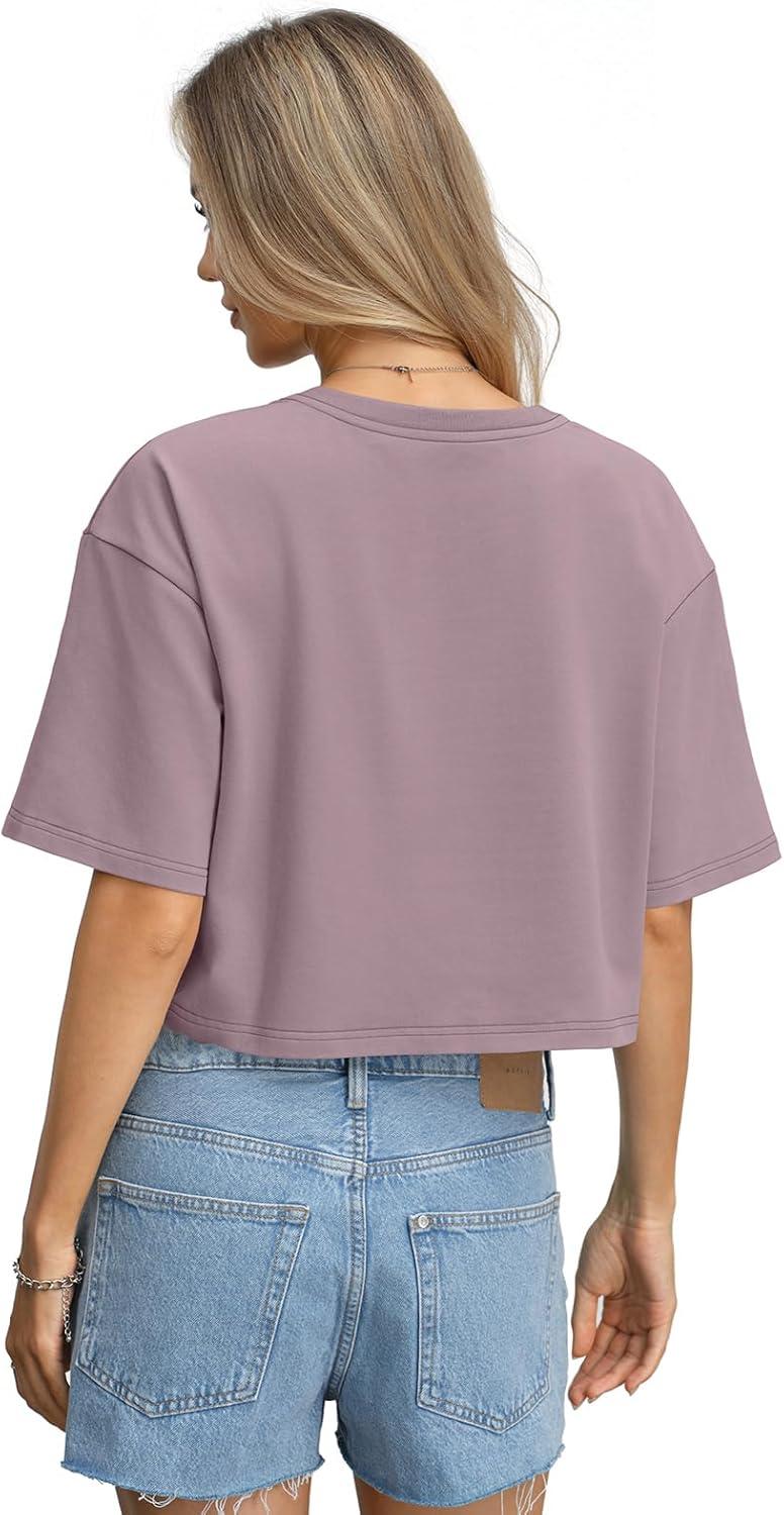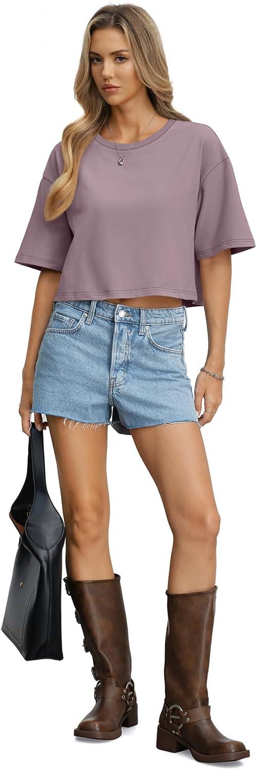 Womens Cotton Boxy Crop Tops Drop Shoulder Loose Fit T-Shirts Trendy Crew Neck Basic Tees Yoga Casual Clothes(Purple)