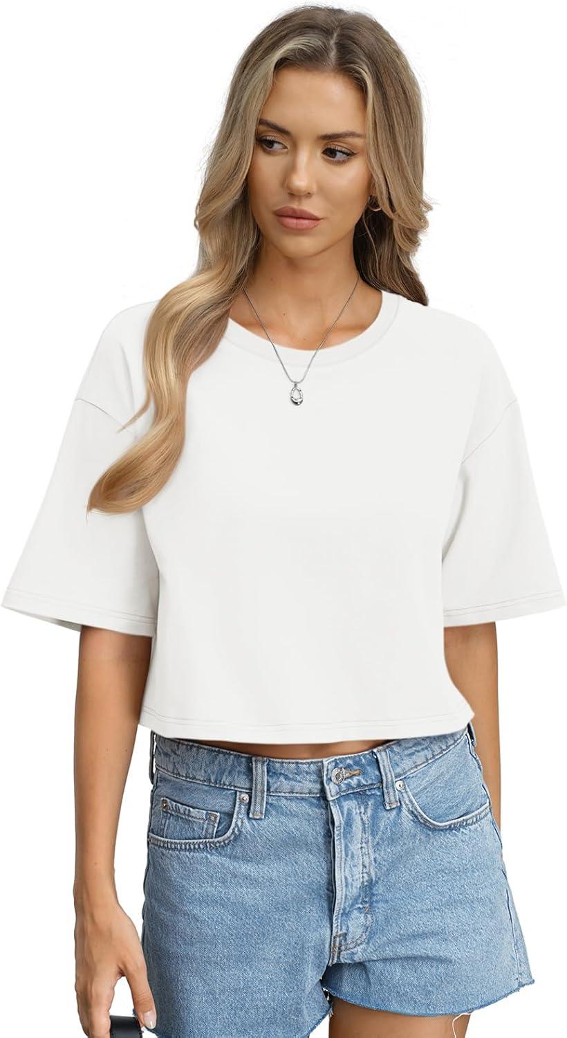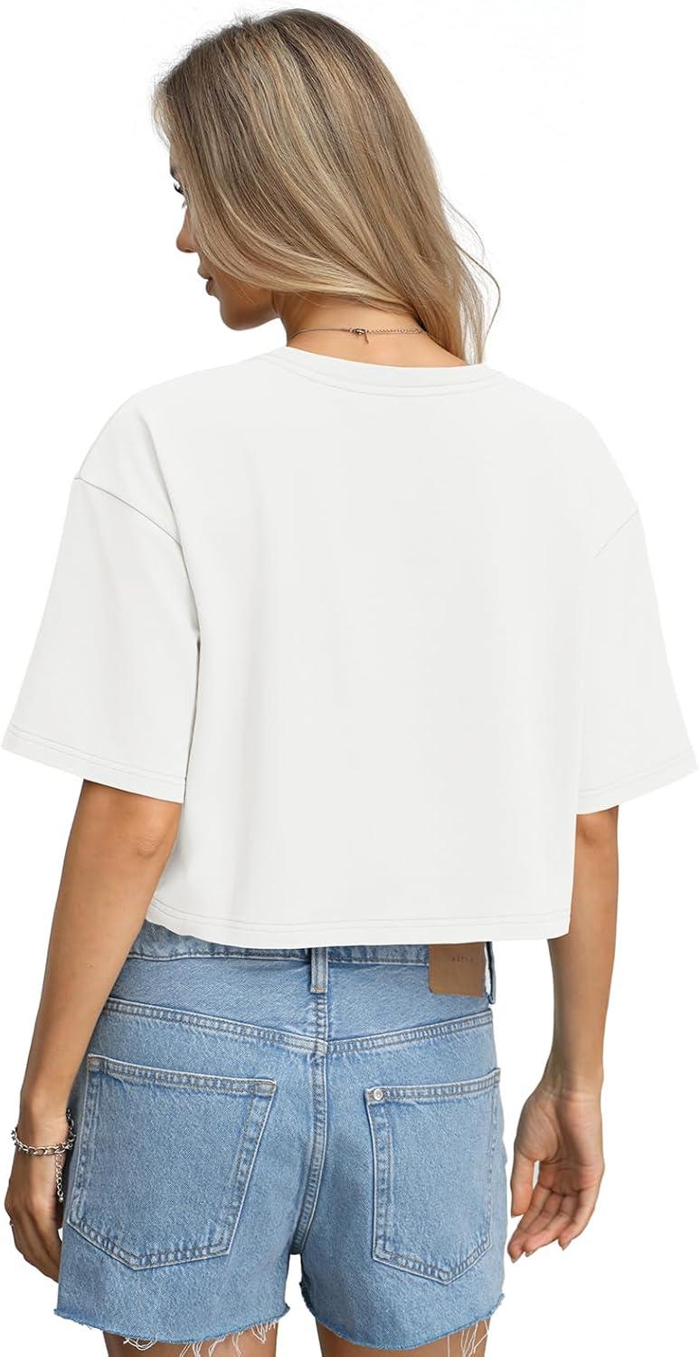Womens Cotton Boxy Crop Tops Drop Shoulder Loose Fit T-Shirts Trendy Crew Neck Basic Tees Yoga Casual Clothes(White)