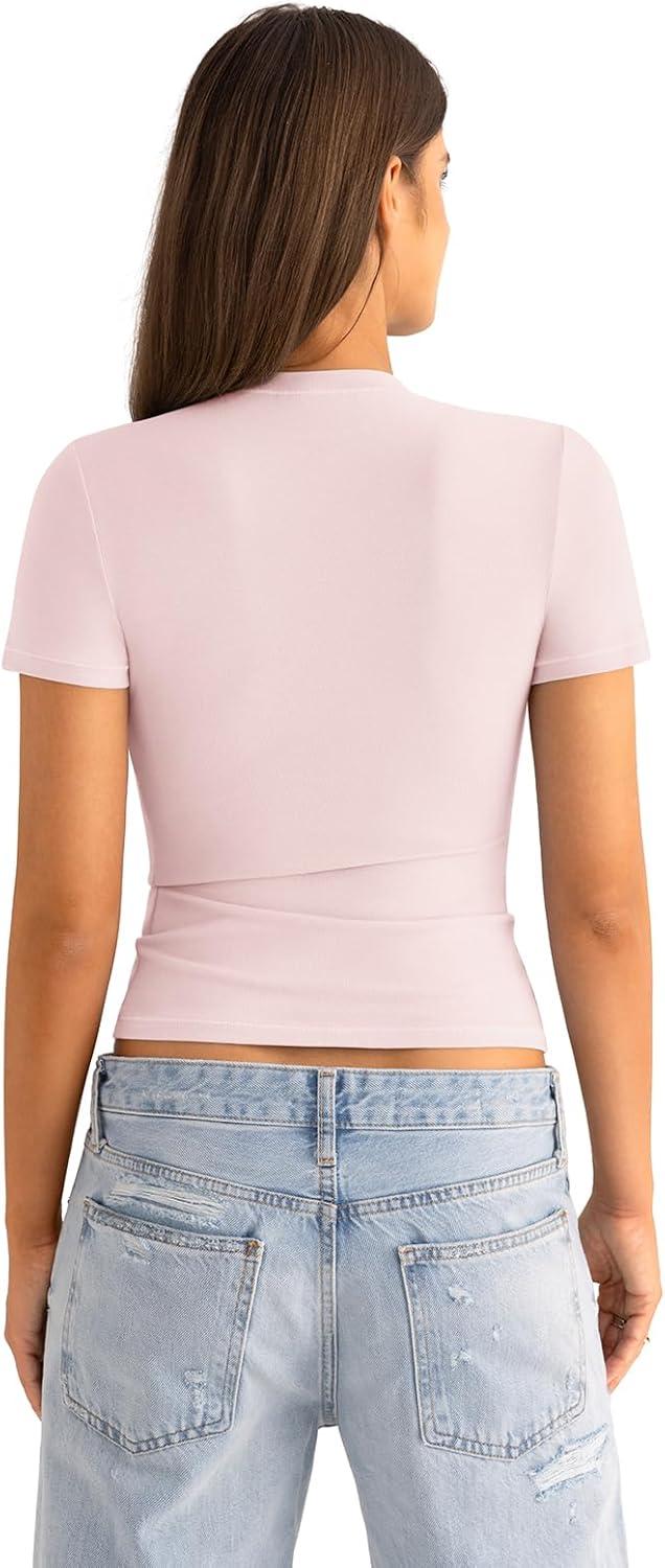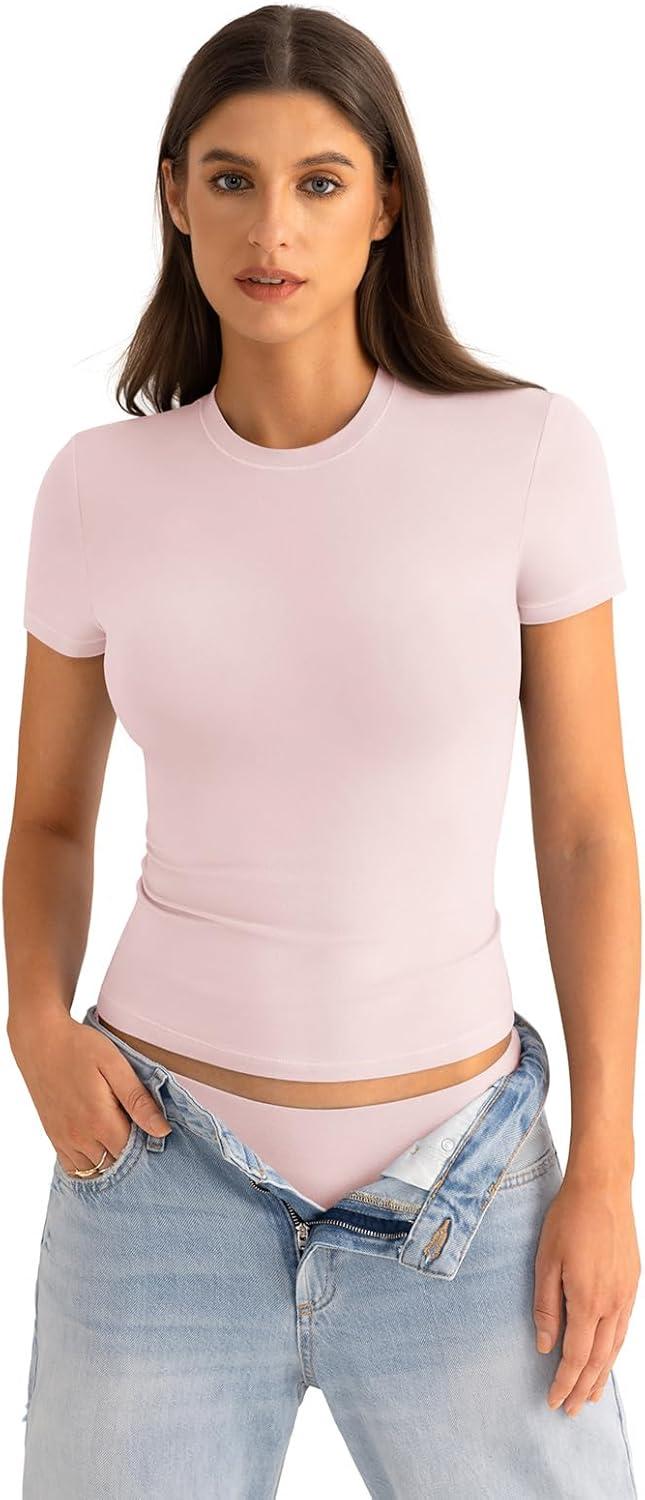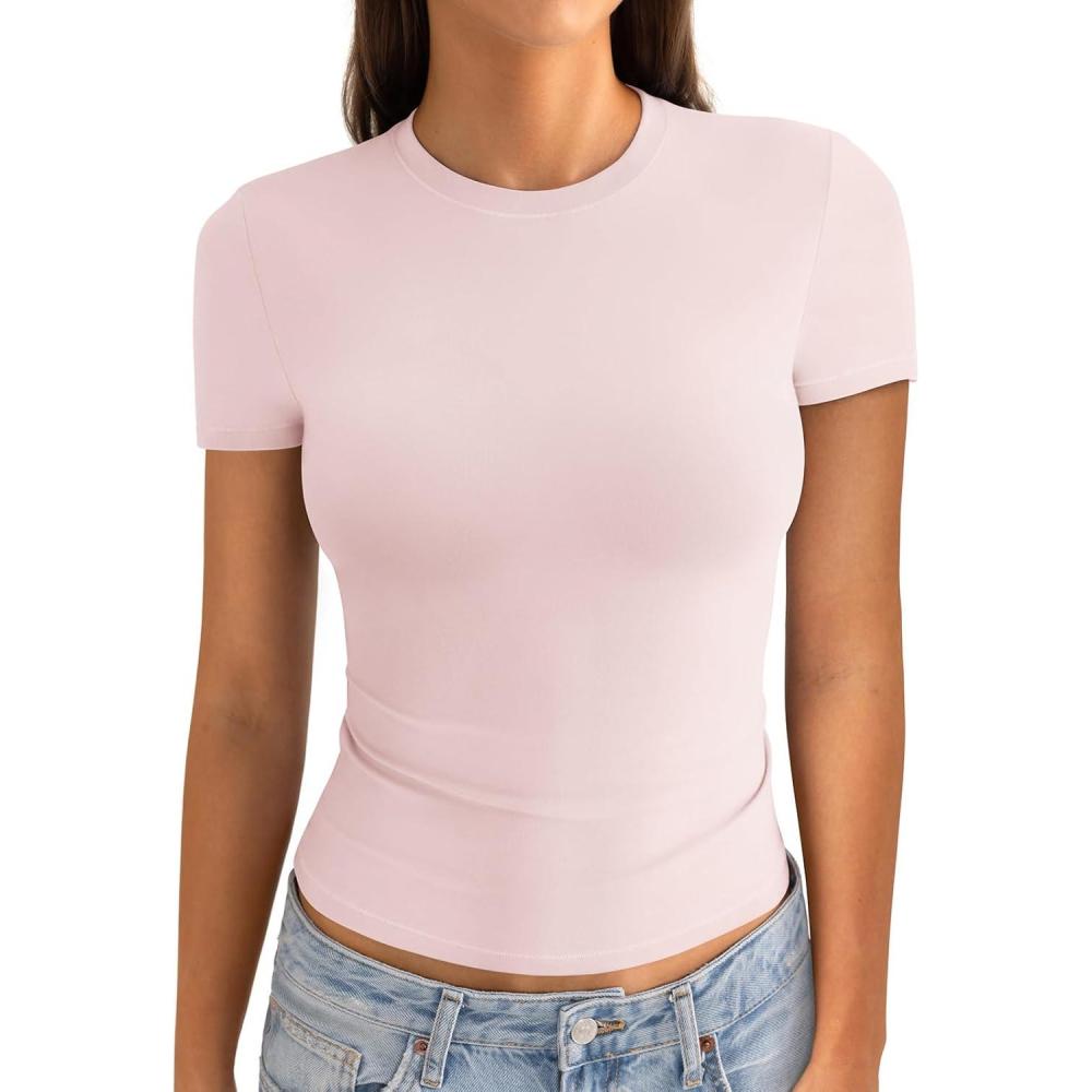 Womens Cotton Crew Neck Short Sleeve Shirts Summer Top Trendy Fitted Crop Tops Basic Going Out Tee(Baby Pink)