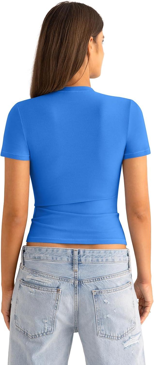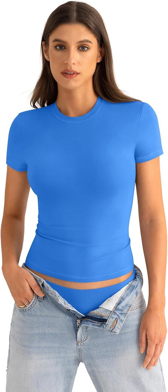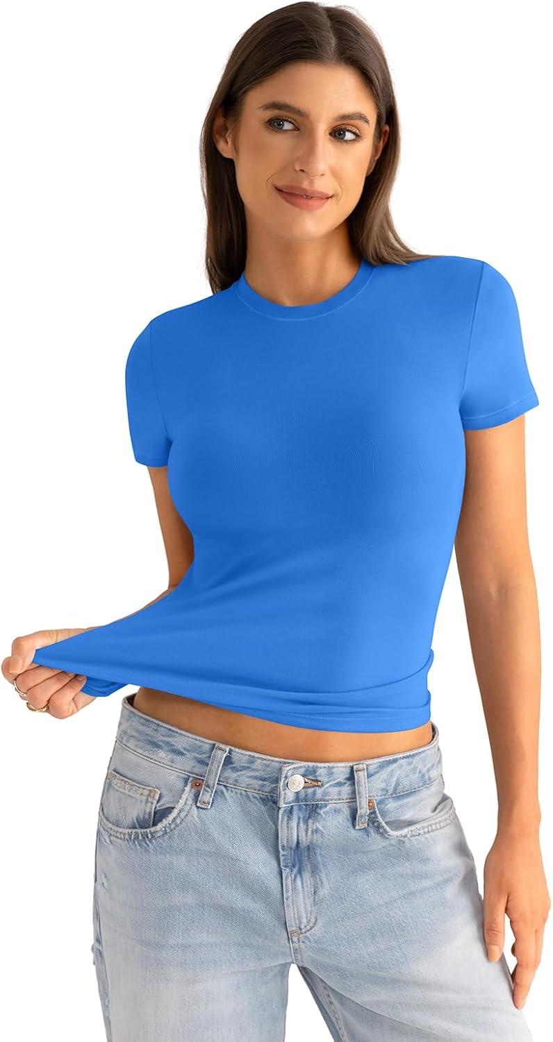Womens Cotton Crew Neck Short Sleeve Shirts Summer Top Trendy Fitted Crop Tops Basic Going Out Tee(Blue)