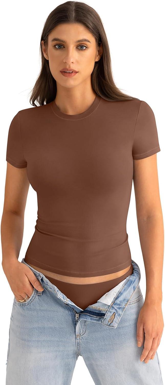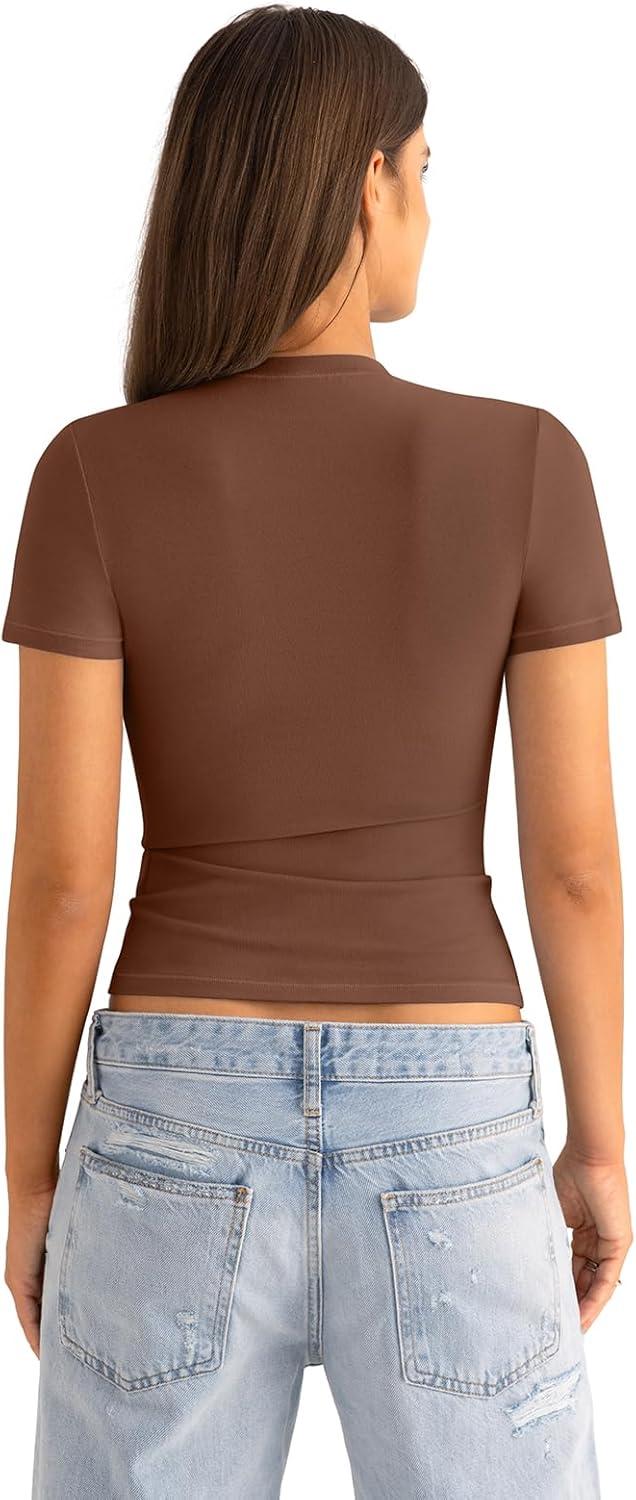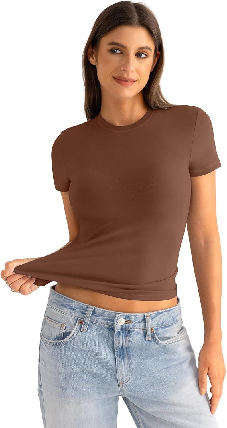 Womens Cotton Crew Neck Short Sleeve Shirts Summer Top Trendy Fitted Crop Tops Basic Going Out Tee(Brown)
