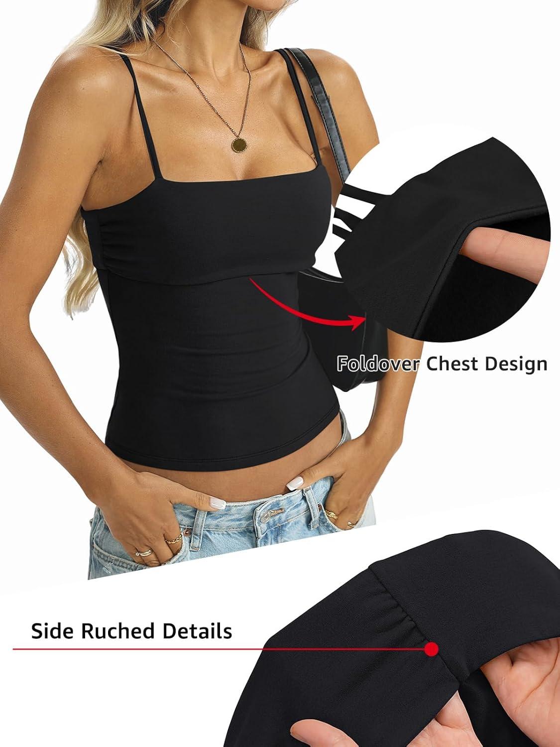 Womens Cotton Foldover Tank Tops Sexy Square Neck Spaghetti Strap Camisole Fitted Y2K Going Out Shirts 2026(True Black)