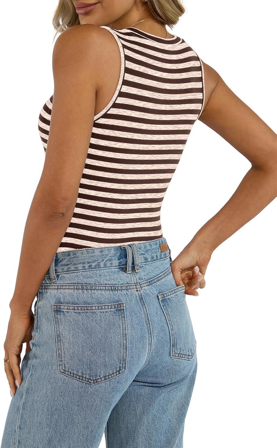 Womens Cotton High Neck Tank Tops Fitted Basic Sleeveless Shirts Summer Casual Outfits 2025(Brown Striped)