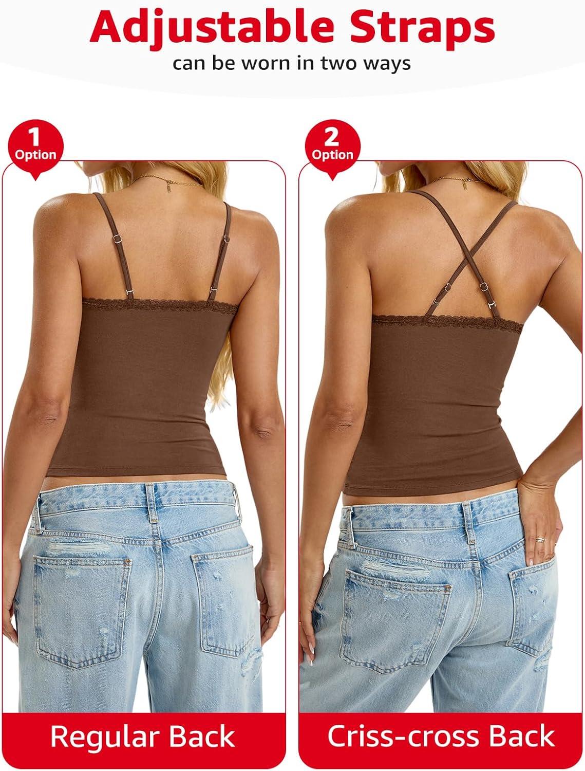 Womens Cotton Lace Camisole Scoop Neck Sexy Cami Top Adjustable Strap Going Out Tops Y2K Summer Clothes 2025(Brown)