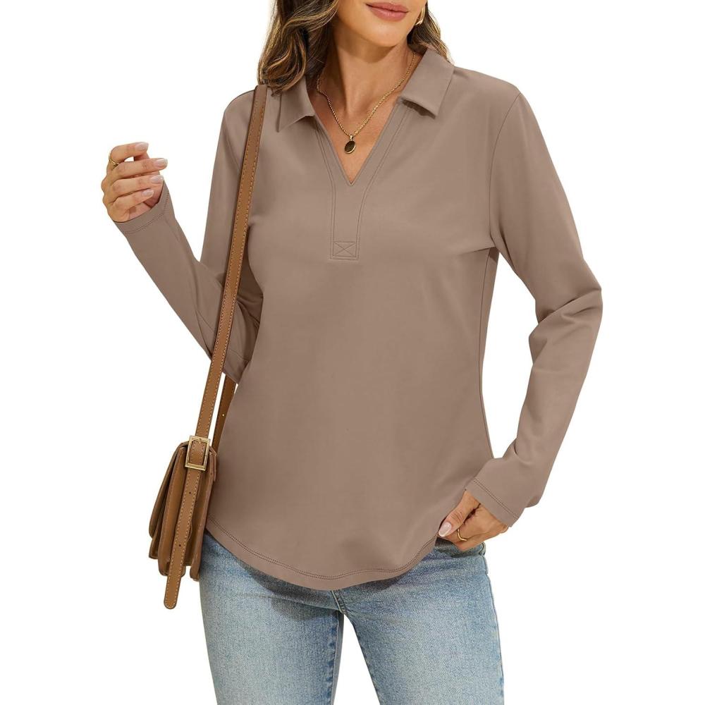 Womens Cotton Long Sleeve Polo Shirts Business Casual V Neck Collared Tops Loose Fit Work Blouses Fall Outfits 2025(Khaki)