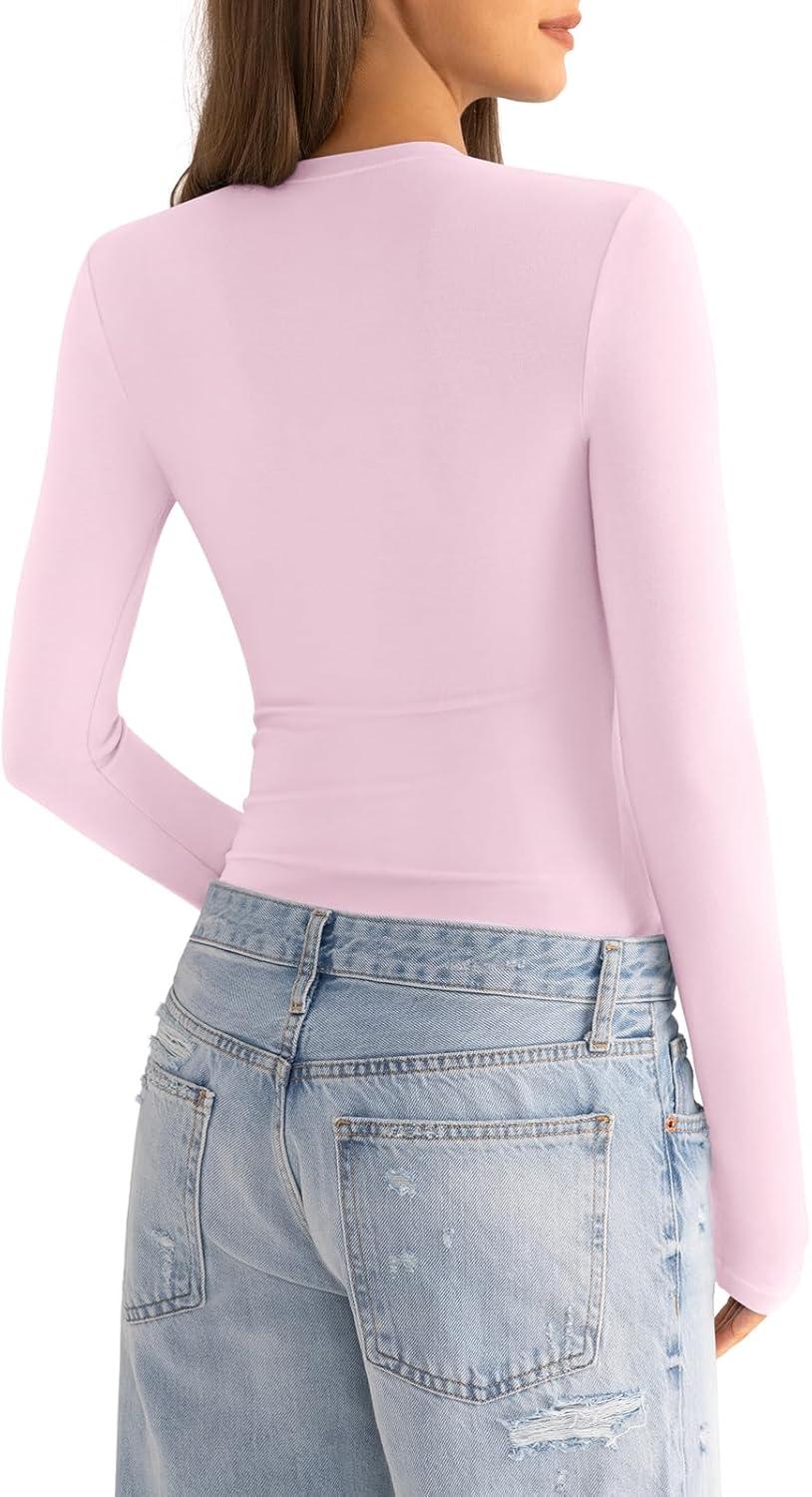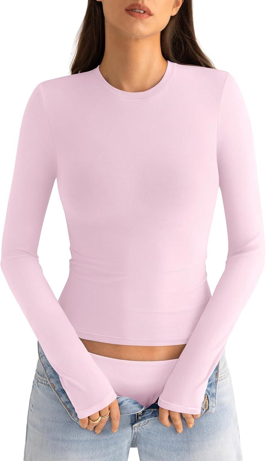 Womens Cotton Long Sleeve Shirts Crew Neck Fitted Basic Going Out Outfits Undershirt Spring Fall Clothes 2025(Baby Pink)
