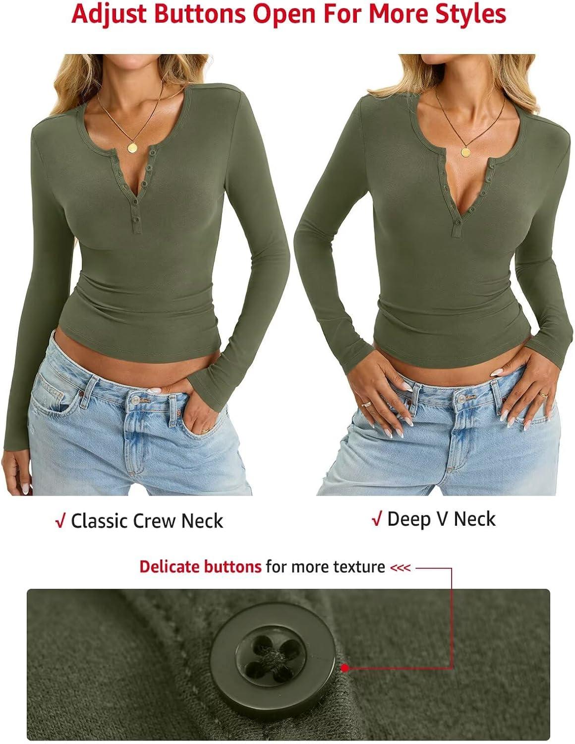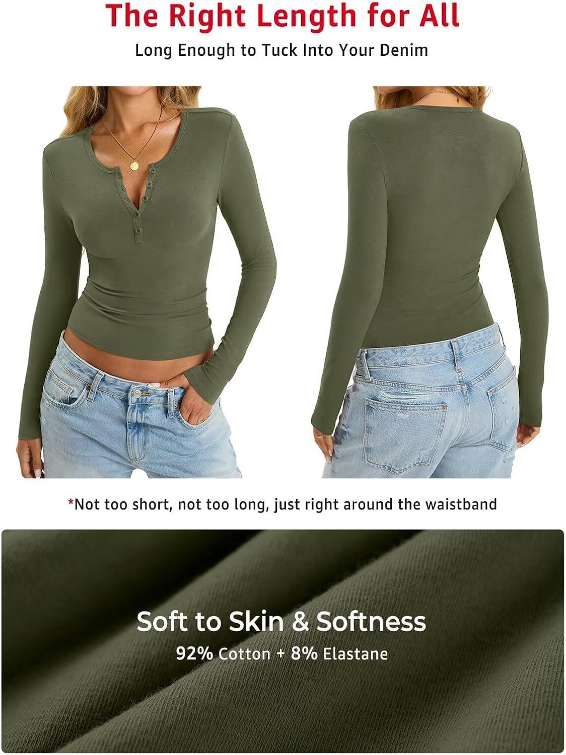 Womens Cotton Long Sleeve Shirts V Neck Henley Tops Slim Fit Basic Going Out Tshirts Fall Fashion Outfits 2025(Army Green)