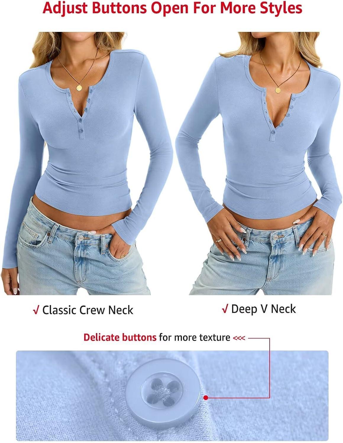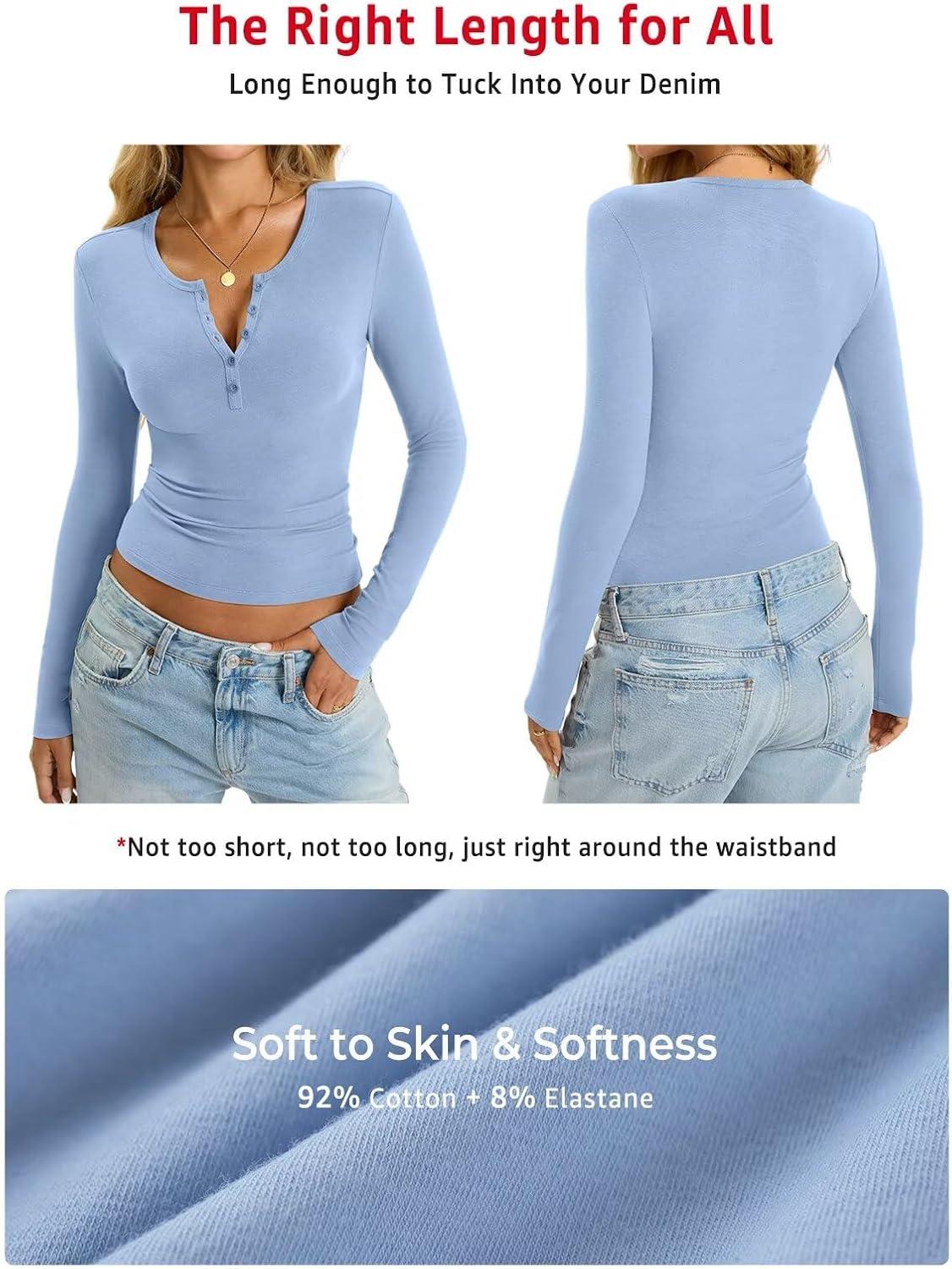 Womens Cotton Long Sleeve Shirts V Neck Henley Tops Slim Fit Basic Going Out Tshirts Fall Fashion Outfits 2025(Baby Blue)