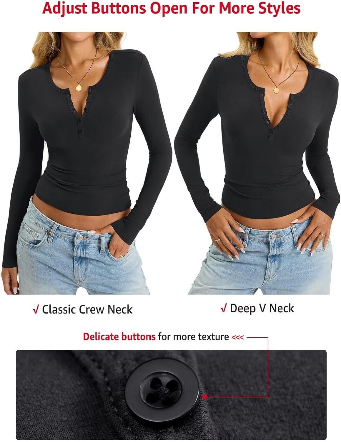 Womens Cotton Long Sleeve Shirts V Neck Henley Tops Slim Fit Basic Going Out Tshirts Fall Fashion Outfits 2025(Black)