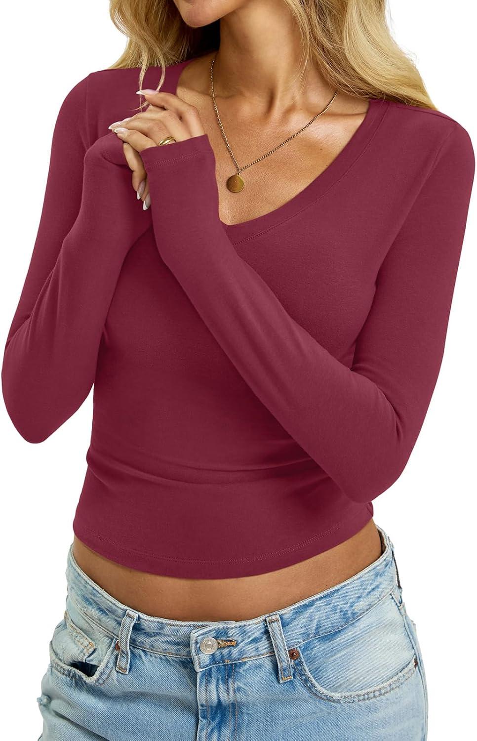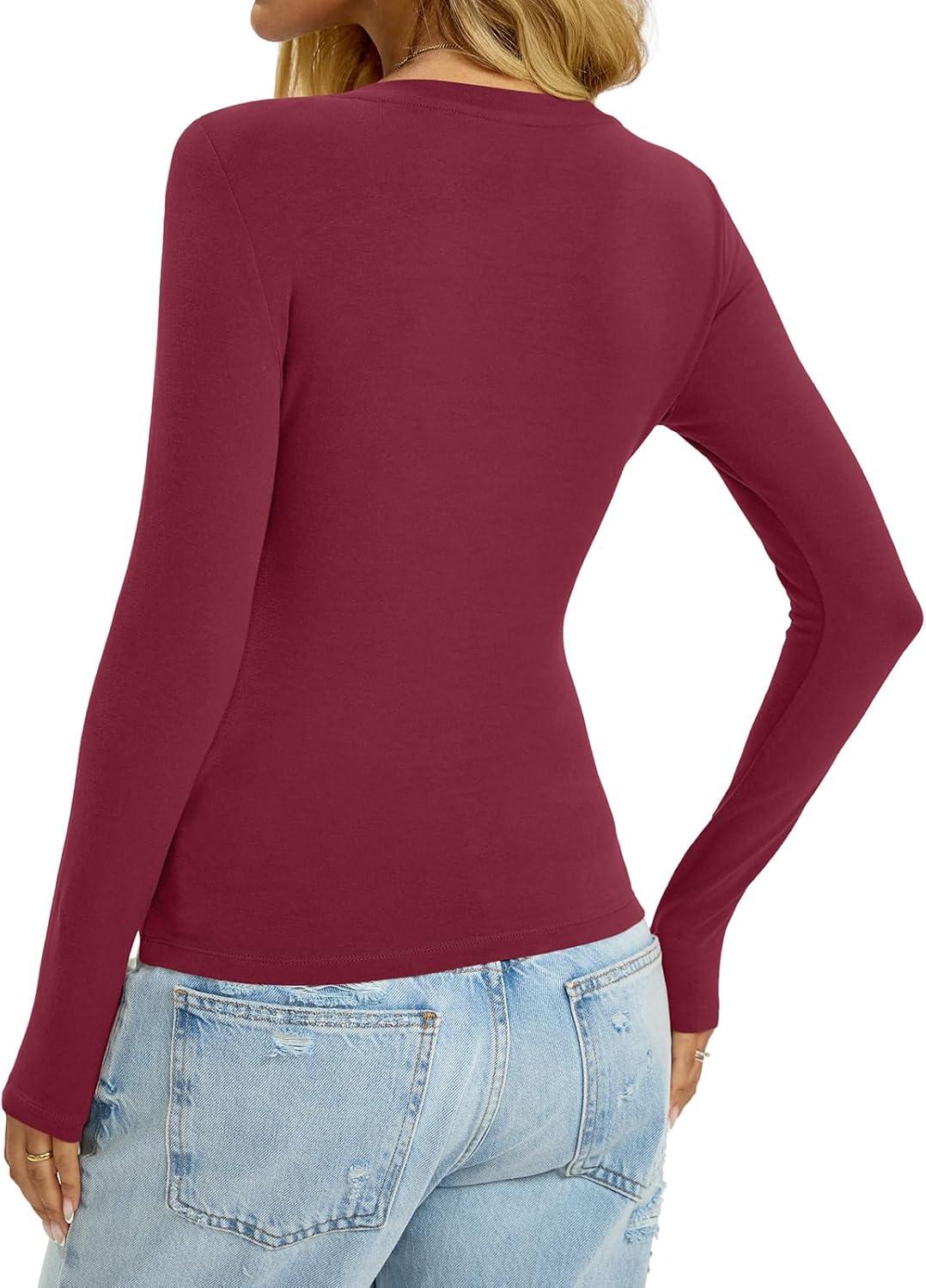 Womens Cotton Long Sleeve Shirts V Neck Slim Fit Tops Basic Tees Going Out Outfits 2025 Fall Spring(Purple Red)